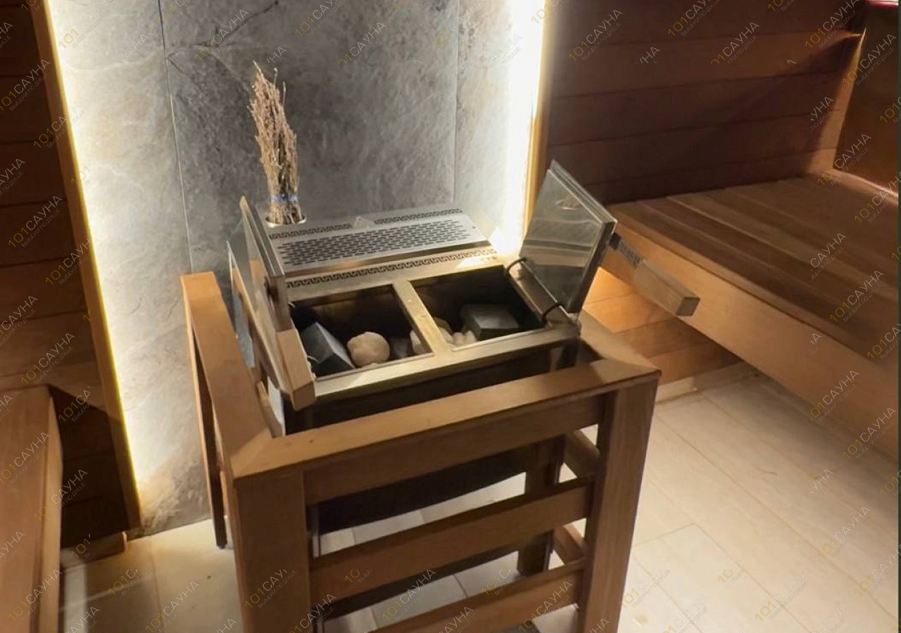 · Уникальная система «второе дыхание» на полке для парения (заправляется льдом и цитрусом для особого климата).