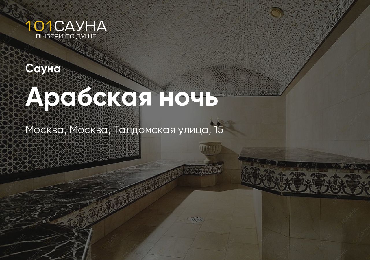 Сауна 'Арабская ночь' - современный комплекс для полного отдыха и восстановления на Талдомской улице. Просторные залы оборудованы финской и турецкой баней, бассейном с подсветкой и подогревом. На территории комплекса - бильярд, караоке, фитнес-тренажеры и банкетный зал для праздничных мероприятий. Идеальное место для семейного отдыха, корпоративных мероприятий и встреч с друзьями. Высокий рейтинг 4.9 из 5 звёзд подтверждает качество обслуживания и комфорт.