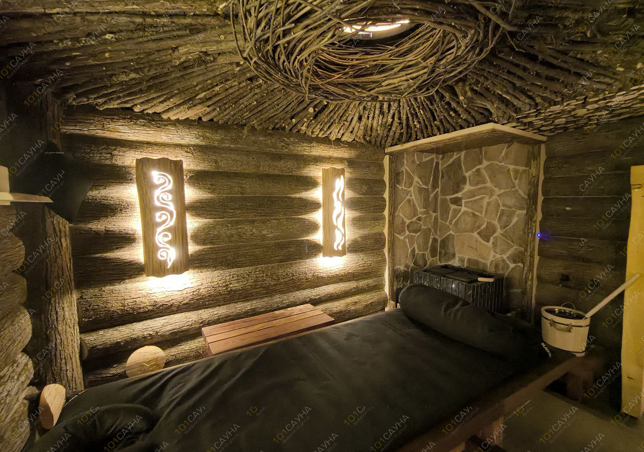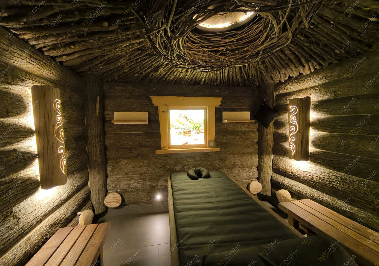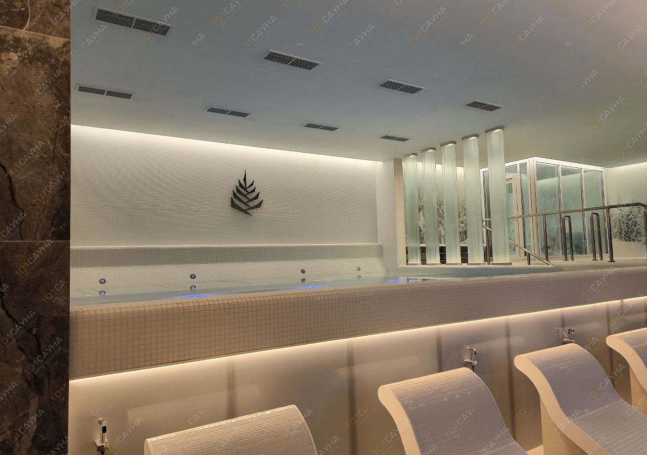 Таежный релакс: гидромассажный бассейн, купель, лежаки, зона с большим экраном и фито-стеной, снежная комната