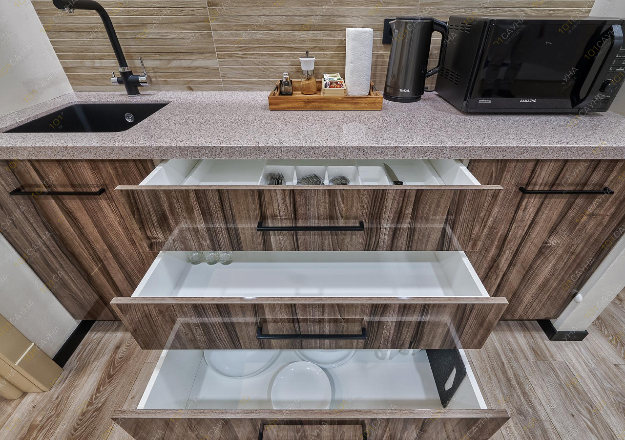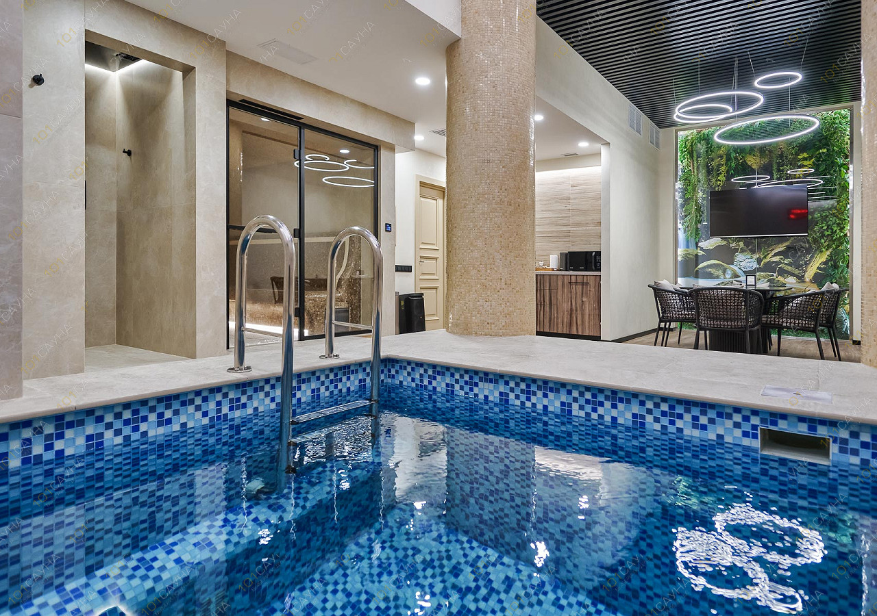 Парная (90 – 120°С), бассейн с подсветкой и циркулирующей водой, две уютные комнаты отдыха, санузел, две душевые, зона отдыха с резным столом и мягкой зоной, спутниковое и кабельное телевидение, караоке, Wi-Fi ждут Вас.