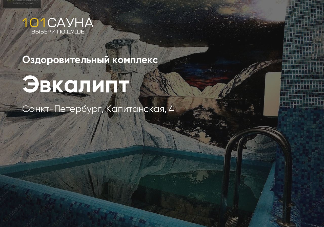 Оздоровительный комплекс «Эвкалипт» — уютный банный клуб на Васильевском острове, расположенный по адресу ул. Капитанская, 4. Заведение работает круглосуточно и принимает гостей индивидуально или компаниями до 12 человек.