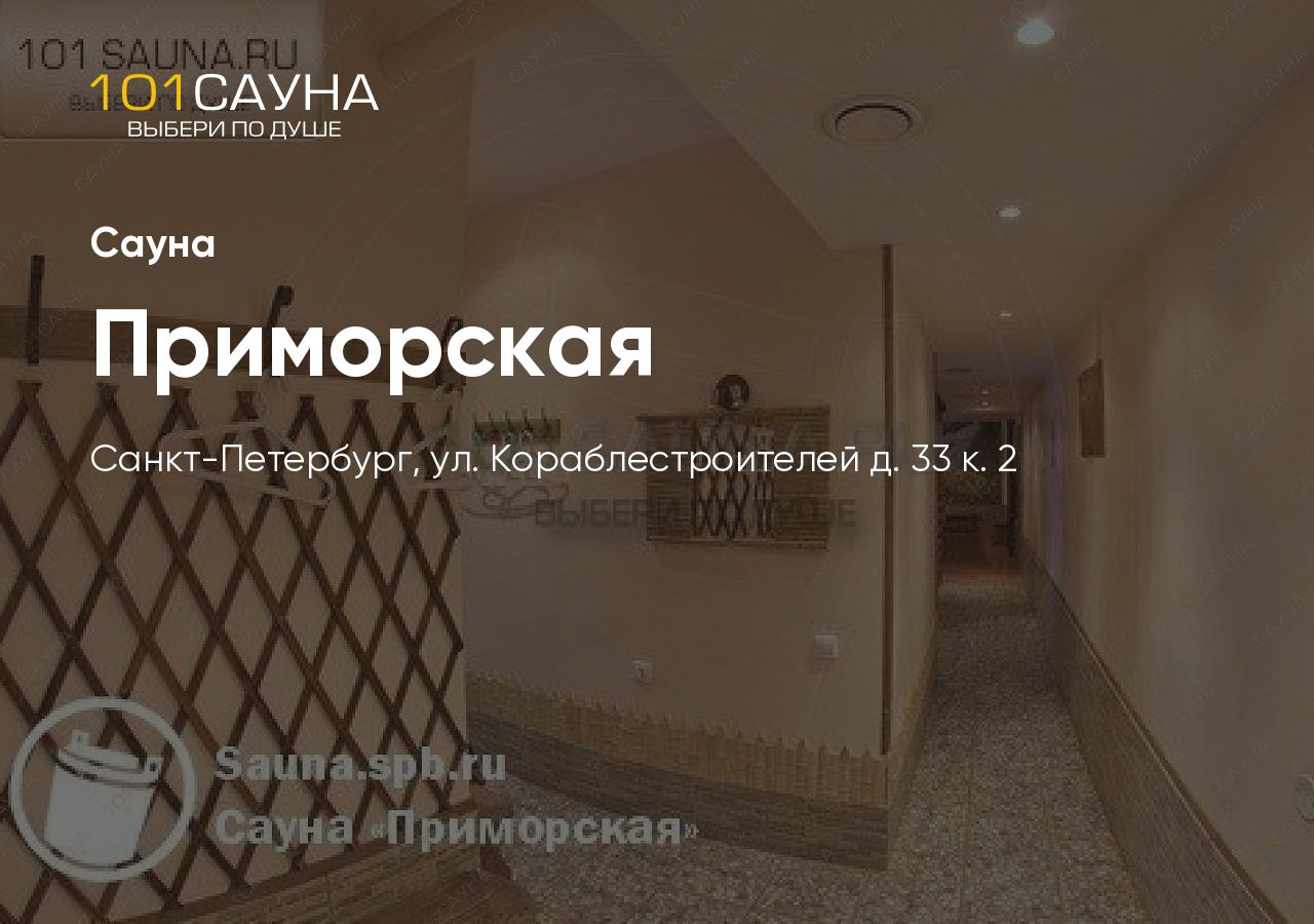 Сауна Приморская расположена при спортивно-оздоровительном центре «Приморский» на улице Кораблестроителей, 33 к. 2, в Василеостровском районе Санкт-Петербурга. Ближайшая станция метро — Приморская.
