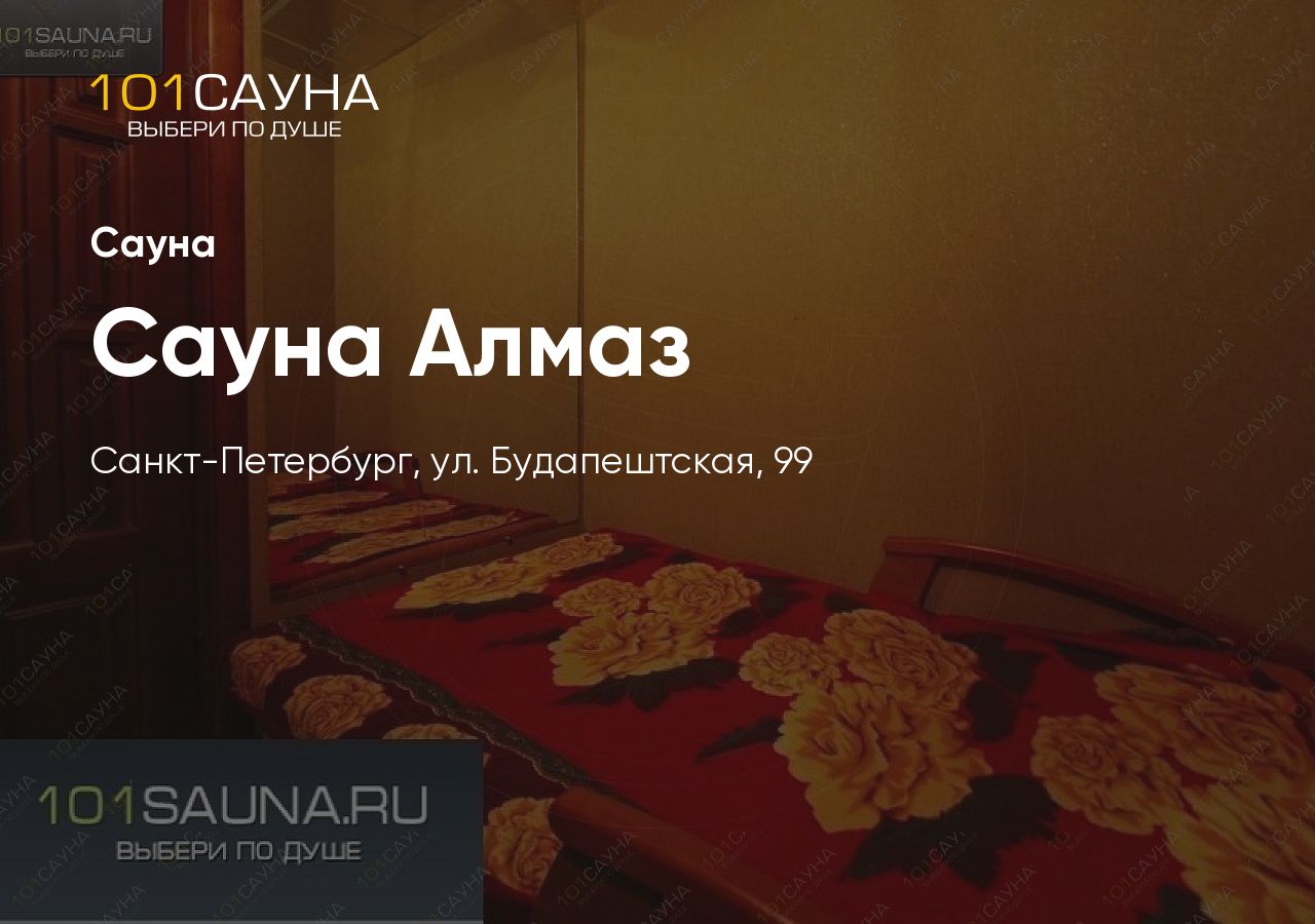 Сауна «Алмаз» расположена по адресу ул. Будапештская, 99 лит А во Фрунзенском районе Санкт-Петербурга. Ближайшее метро — Купчино, остановка Купчино. Сауна находится в тихом дворе спального района.
