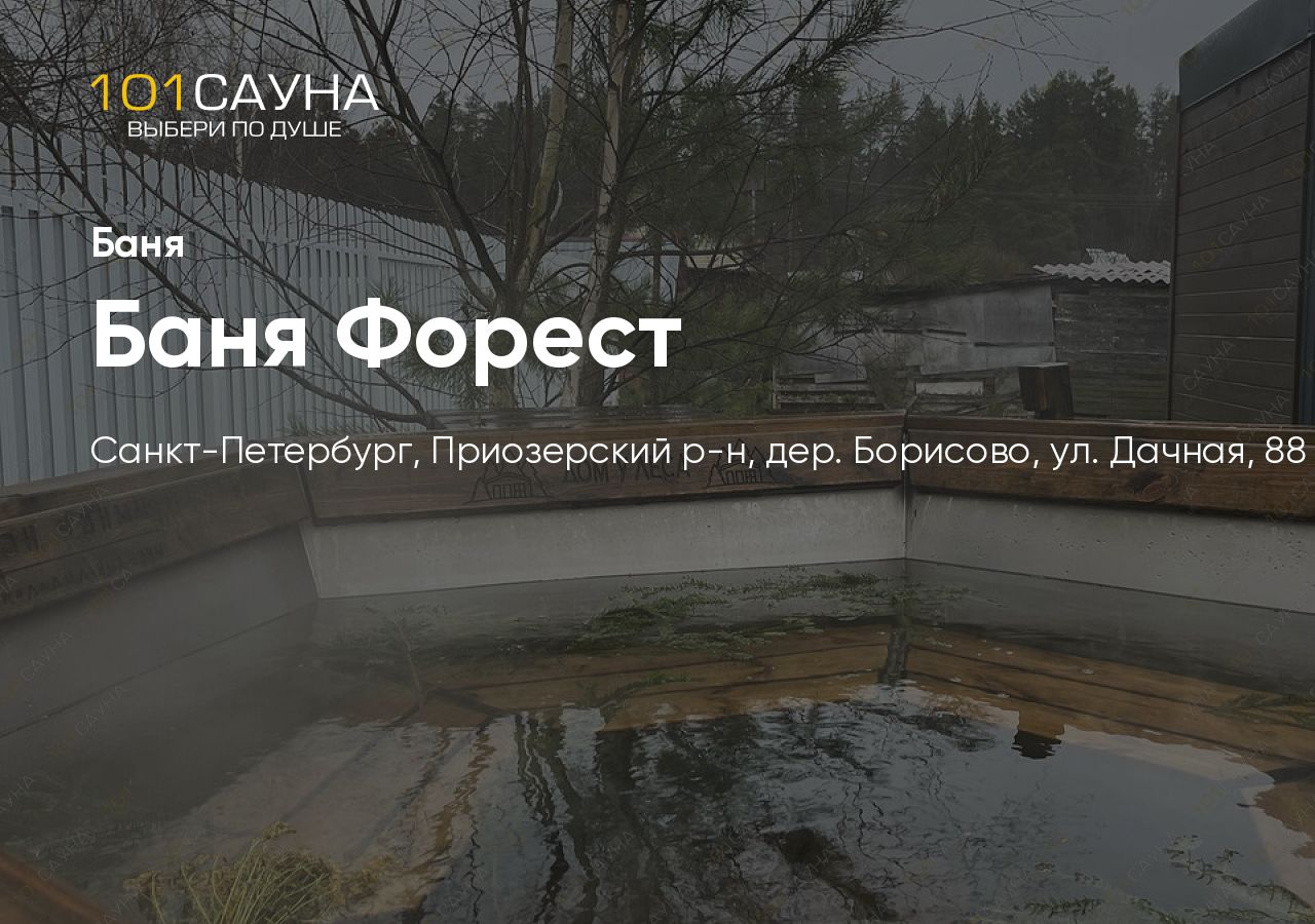 Баня Форест расположена в живописном уголке Ленинградской области, в деревне Борисово Приозерского района, среди сосновых лесов. Это уютный банный комплекс с атмосферой загородного отдыха для компаний.