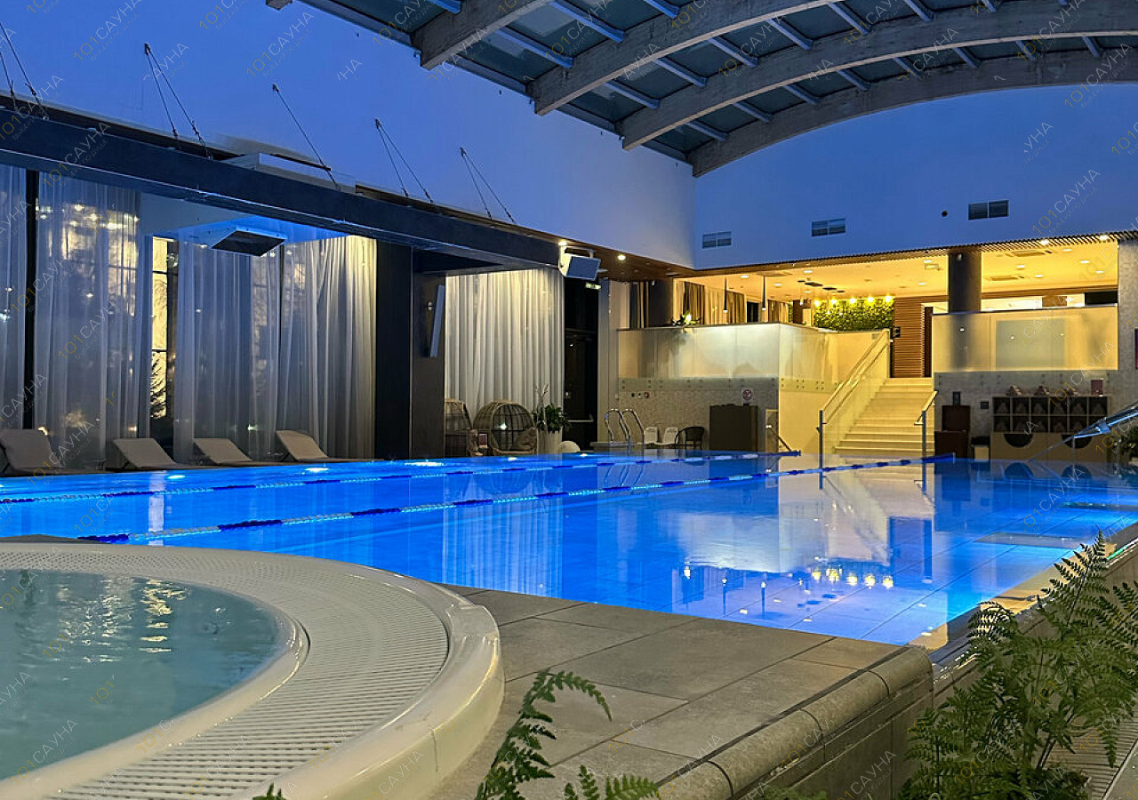 Сердце комплекса — 20-метровый панорамный бассейн с панорамными окнами и противотоком. К услугам гостей также джакузи с гидромассажем, контрастные души, снежный фонтан и ледяной водопад.
