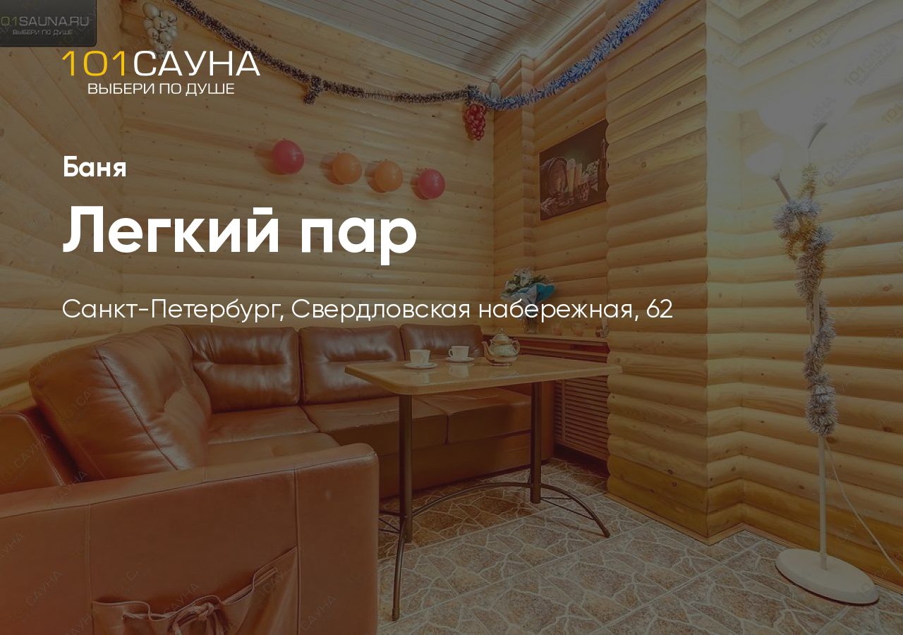 «Лёгкий Пар» — компактная семейная сауна в отдельном нежилом здании на Свердловской набережной в Красногвардейском районе Санкт-Петербурга. Общая площадь около 50 квадратных метров, разделённых на две зоны: зону отдыха и зону СПА.