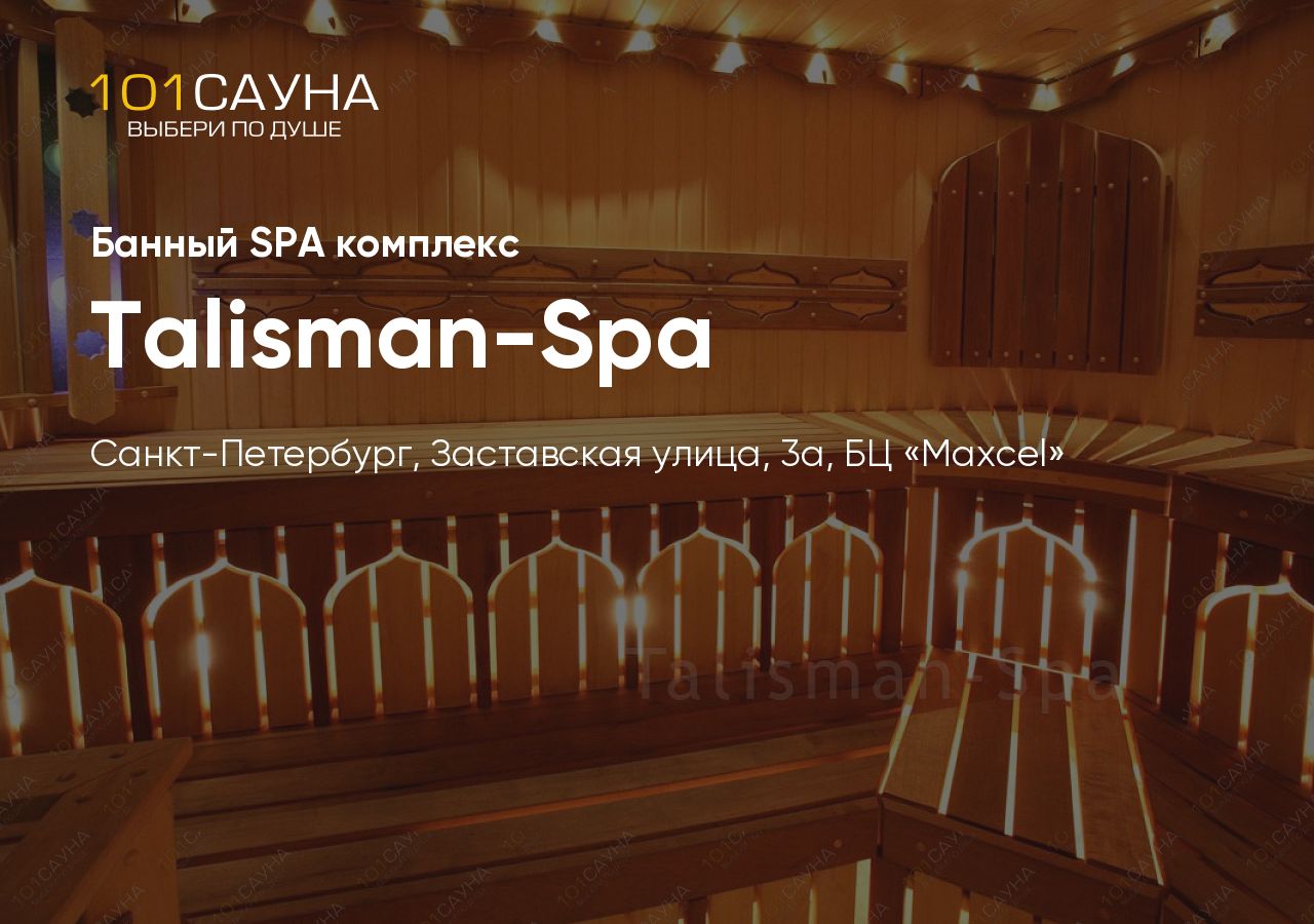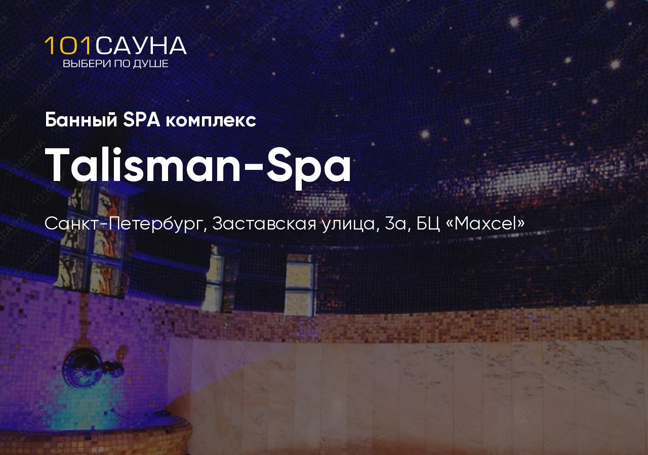 Talisman-Spa — эксклюзивный банный SPA-комплекс в Московском районе Санкт-Петербурга, расположенный в бизнес-центре «Maxcel» на Заставской улице. Комплекс создан для тех, кто ценит уединение, роскошь и настоящее расслабление в компании до 8 человек.