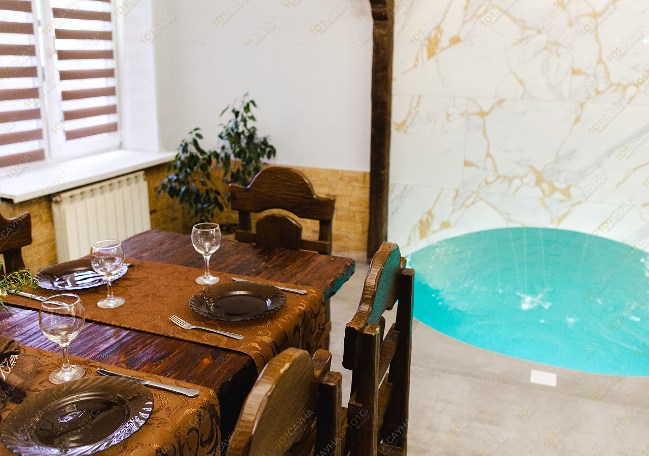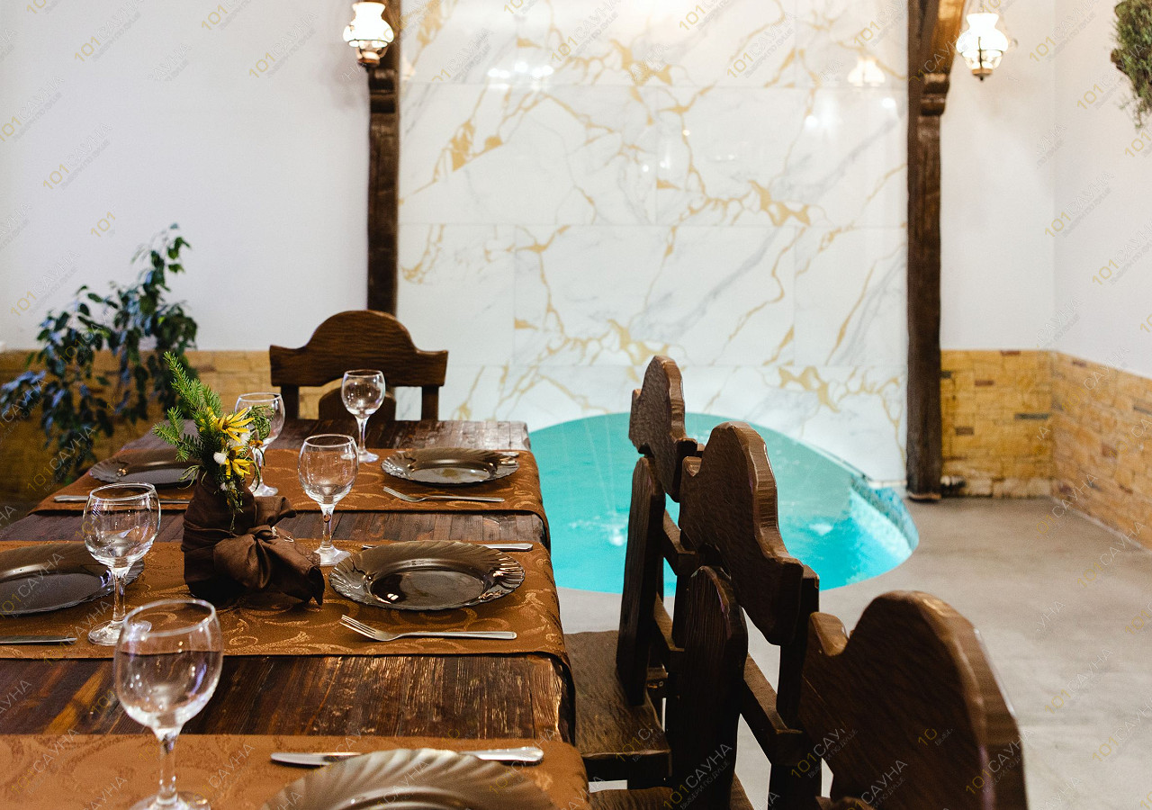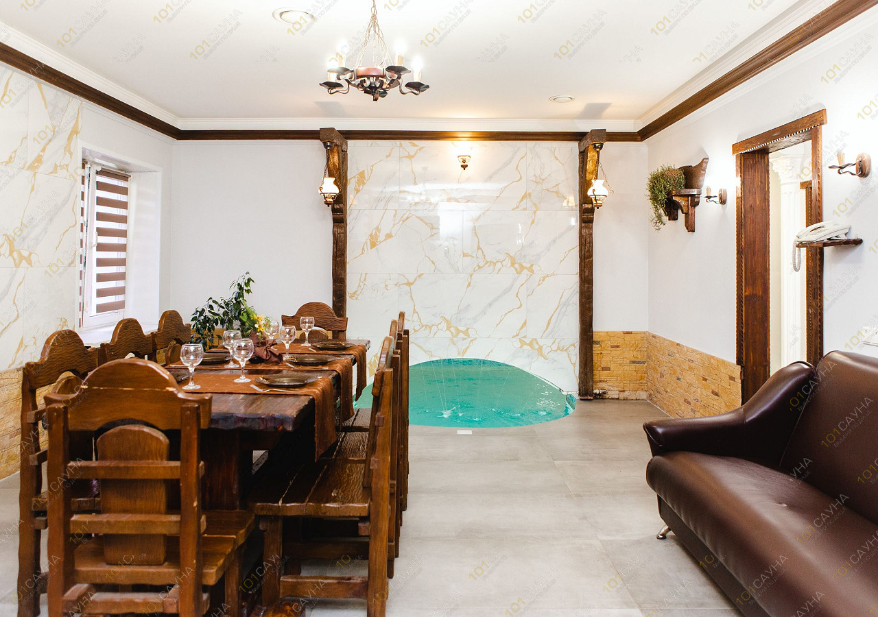 Предлагаем выбор услуг: бассейн, 2 комнаты отдыха, 2 душевые, раздевалка, ТВ, музыка, гостиная (камин, диван, массажное кресло, мини кухня, стол, стулья).