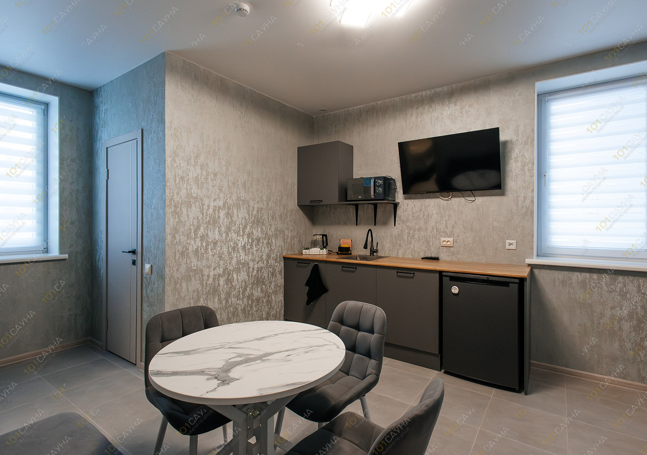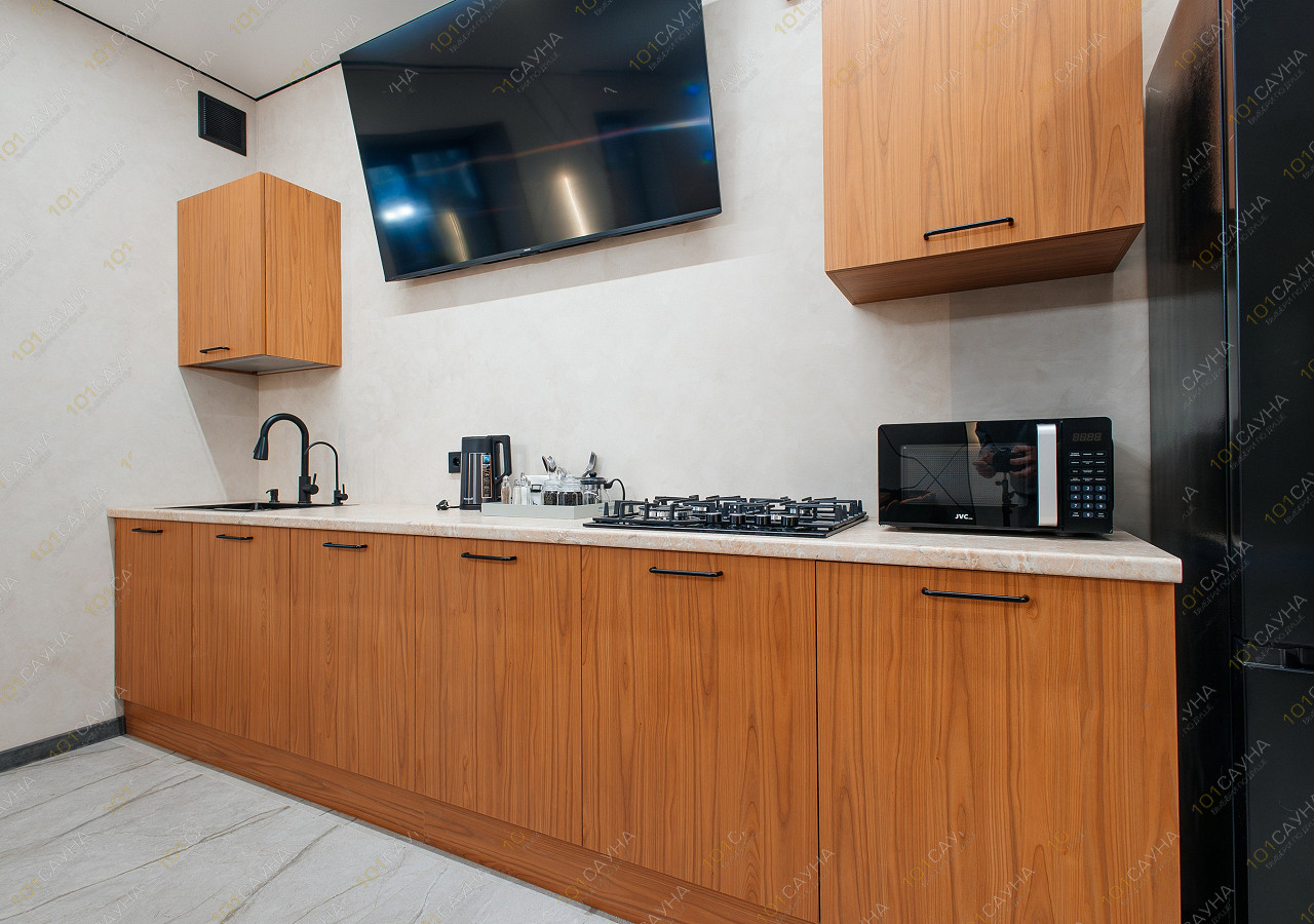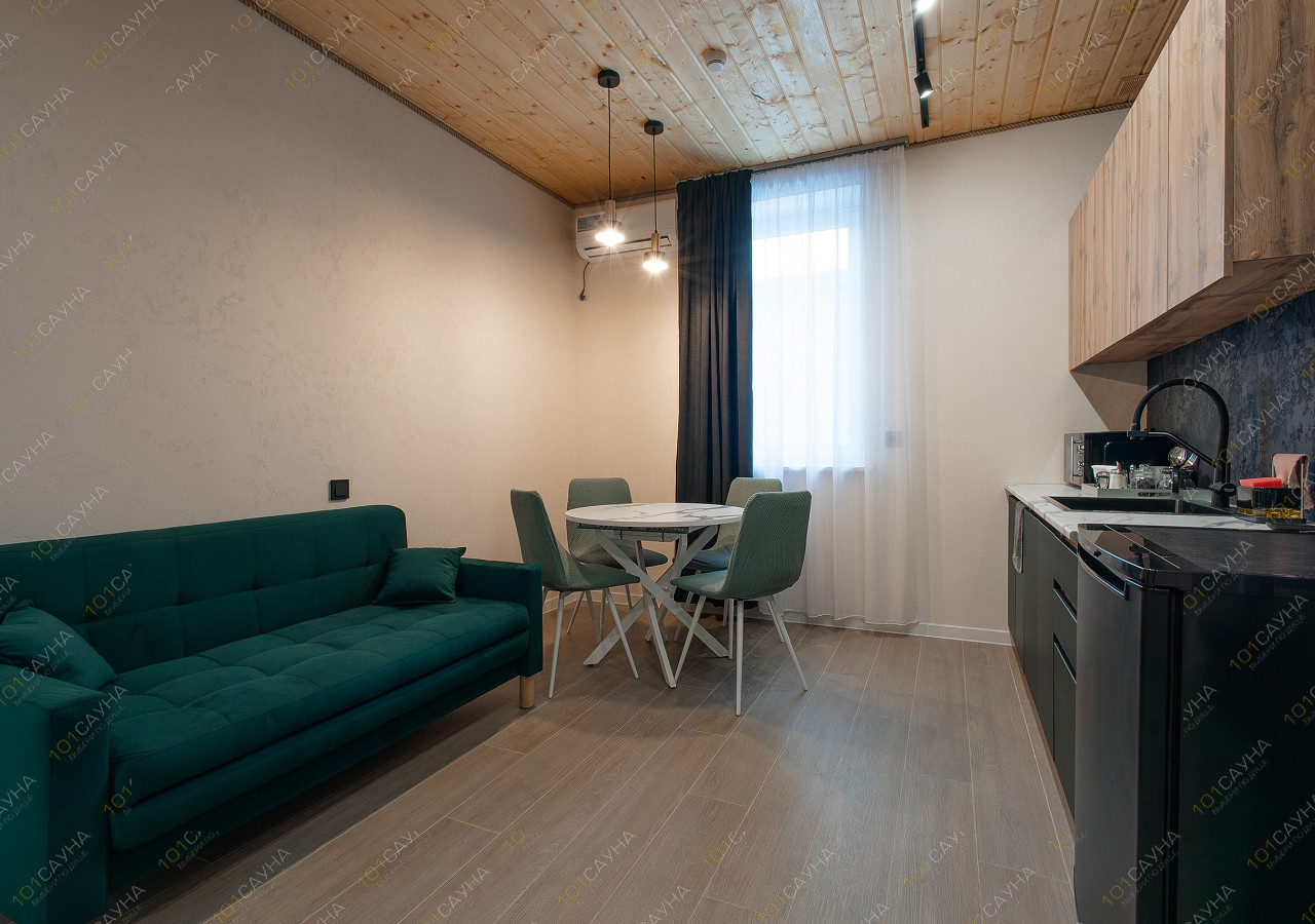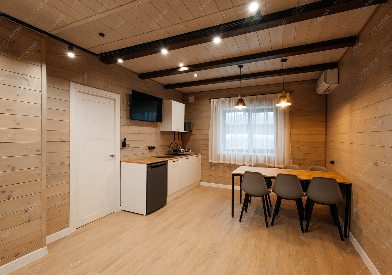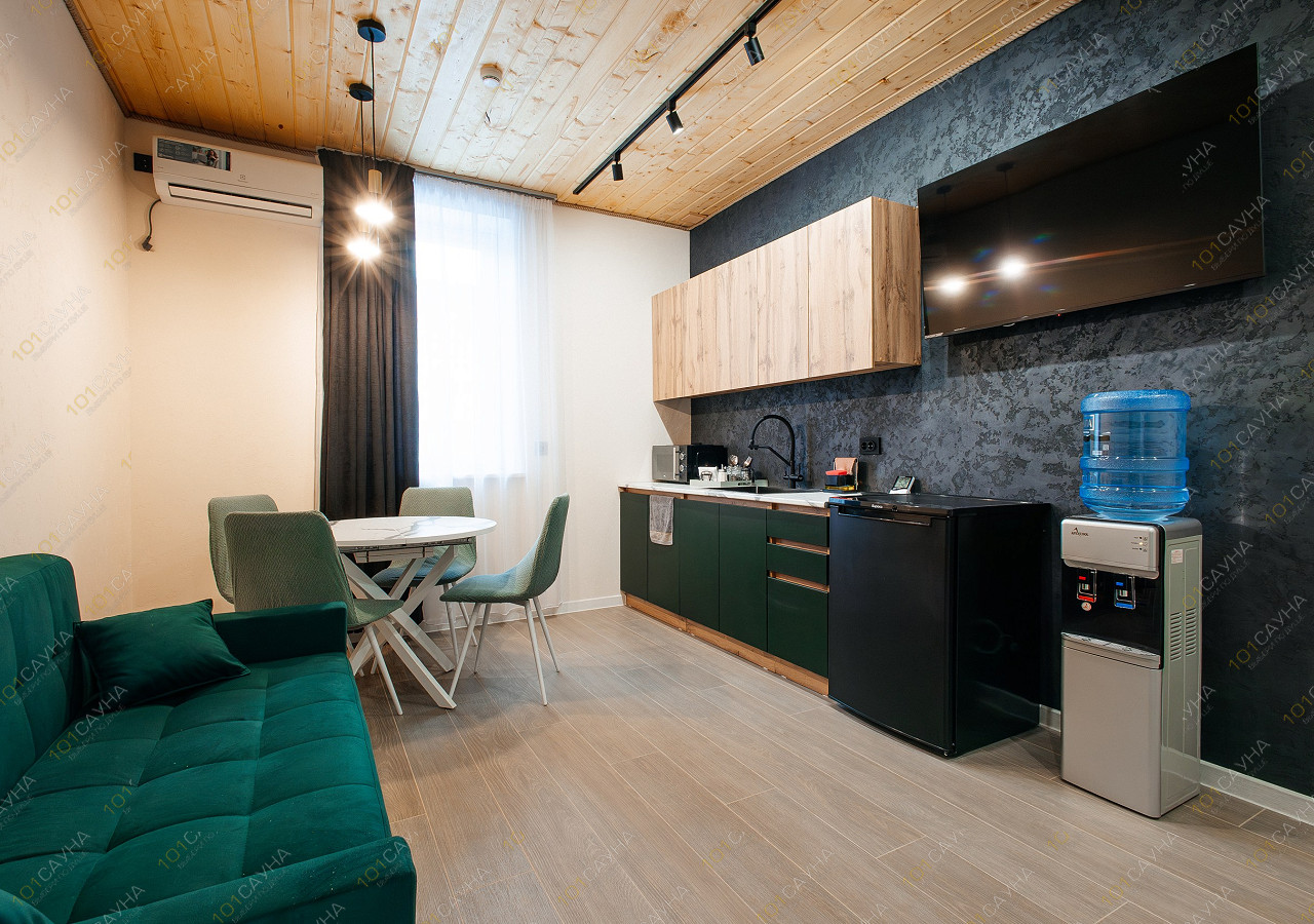 гостиная с кухонной зоной (вся необходимая посуда, столовые приборы). Витаминный чай; сауна с вениками.