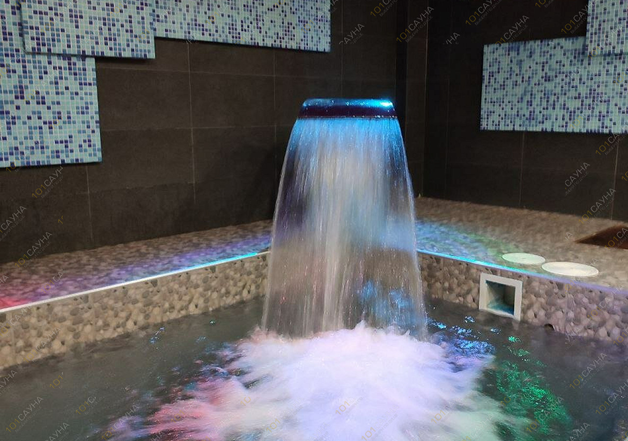 Гордость сауны — бассейн с декоративным водопадом и подсветкой. После жаркой парной можно окунуться в прохладную воду бассейна, наслаждаясь красивой подсветкой и звуком падающей воды.