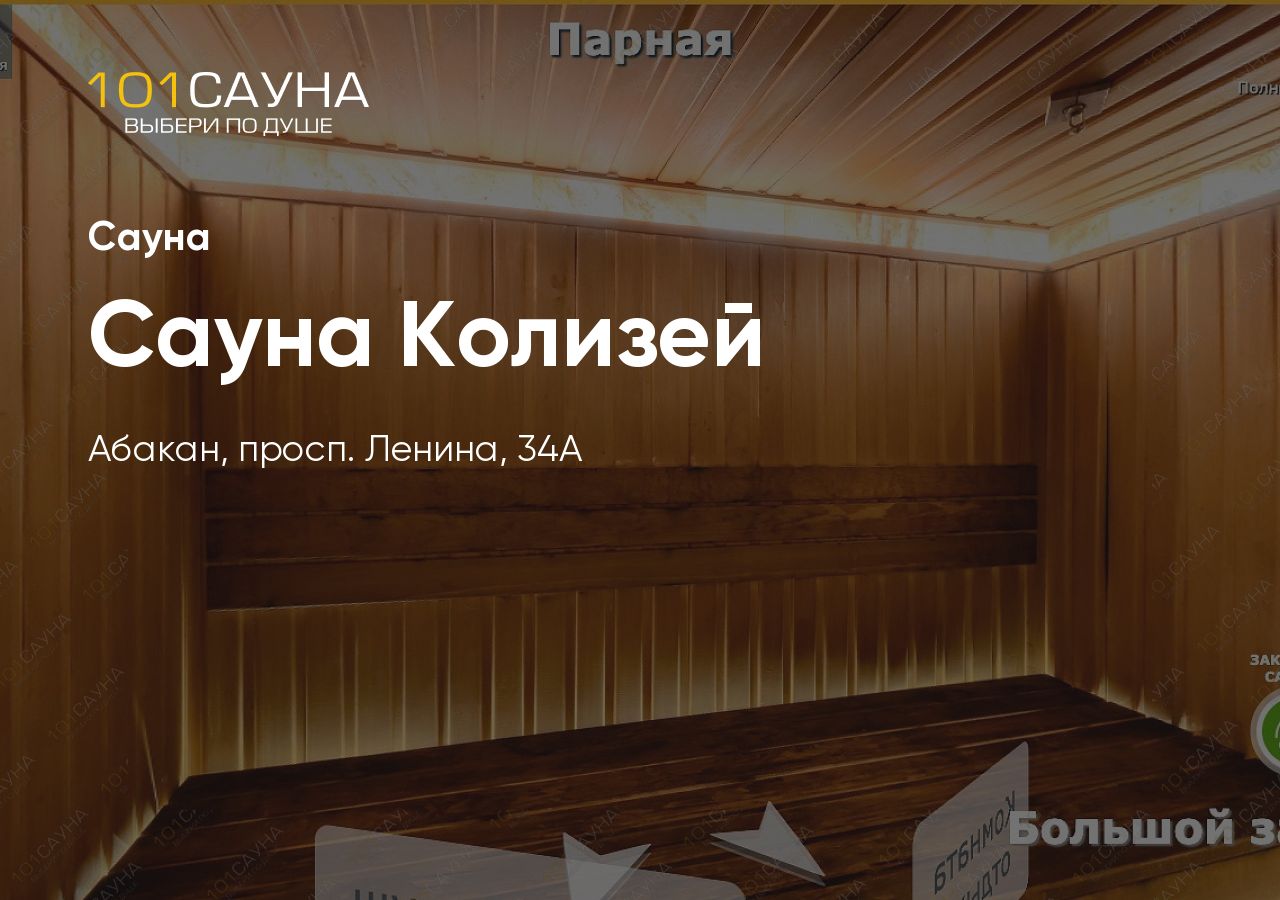 Сауна Колизей — это уютный банный комплекс в центре Абакана на проспекте Ленина. Заведение входит в сеть саун, работающих под управлением компании abakan-sauna.ru, и предлагает гостям два зала на выбор — Малый и Большой.
