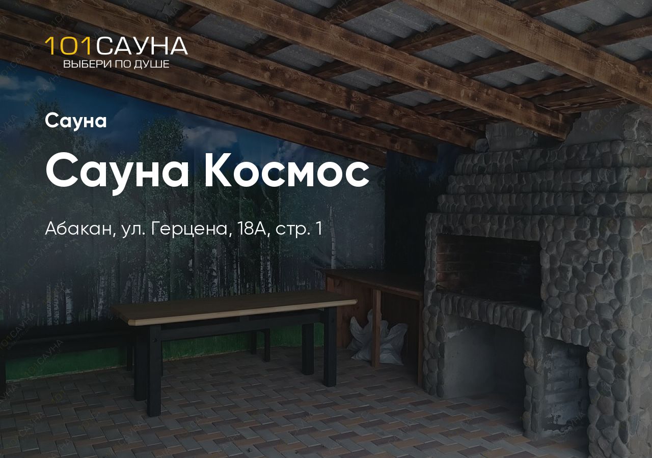Сауна «Космос» — это два зала для комфортного отдыха в центре Абакана. Расположена по адресу ул. Герцена, 18А, стр. 1. Работает круглосуточно, без выходных. Цены — от 800 ₽/час.