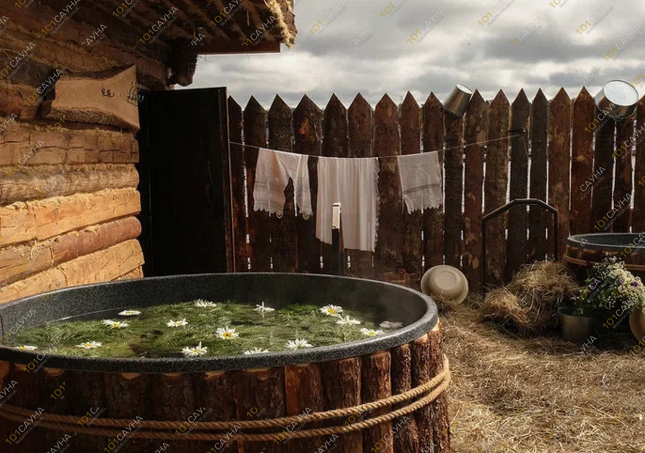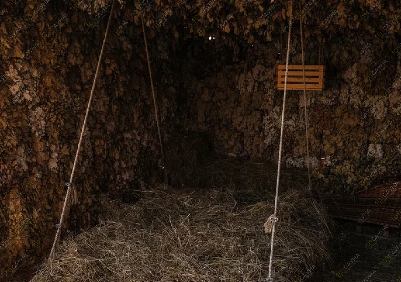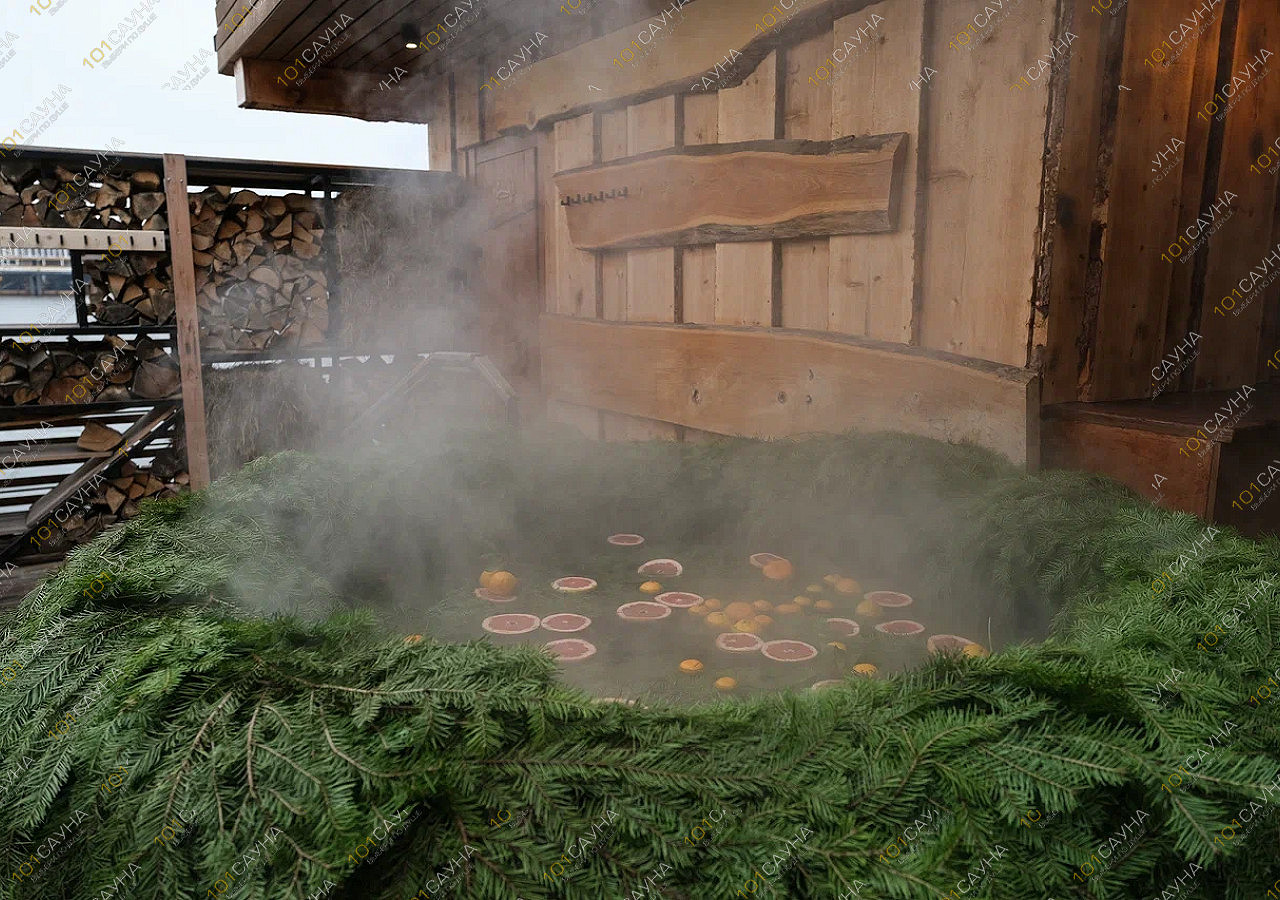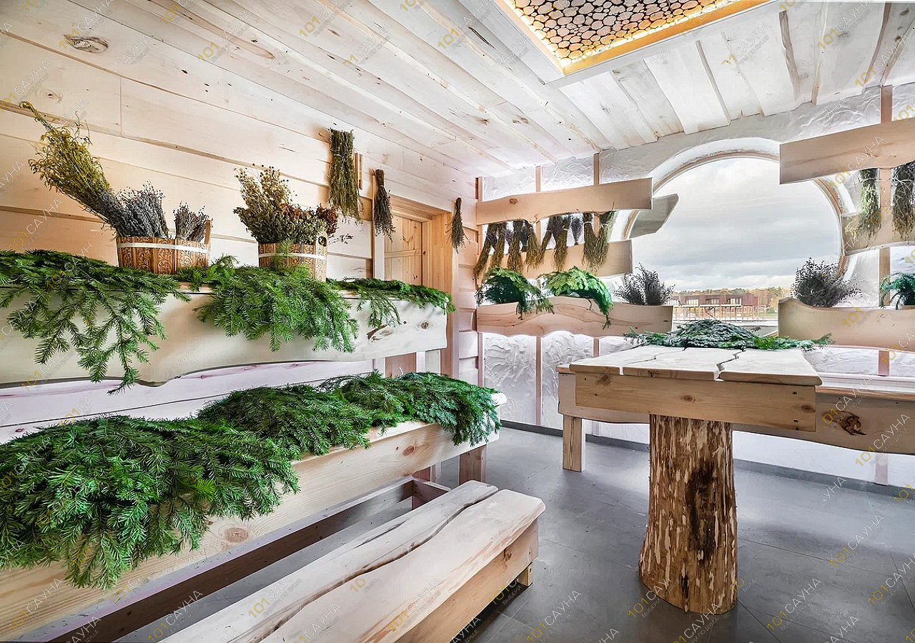 Просторная баня из ароматной липы обволакивает целебным паром.