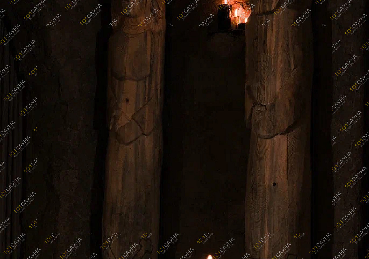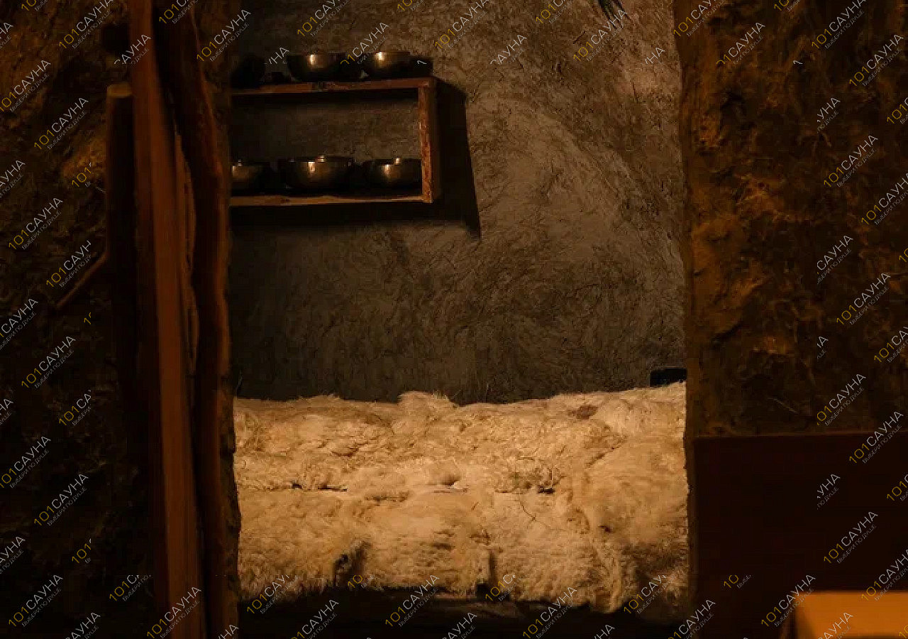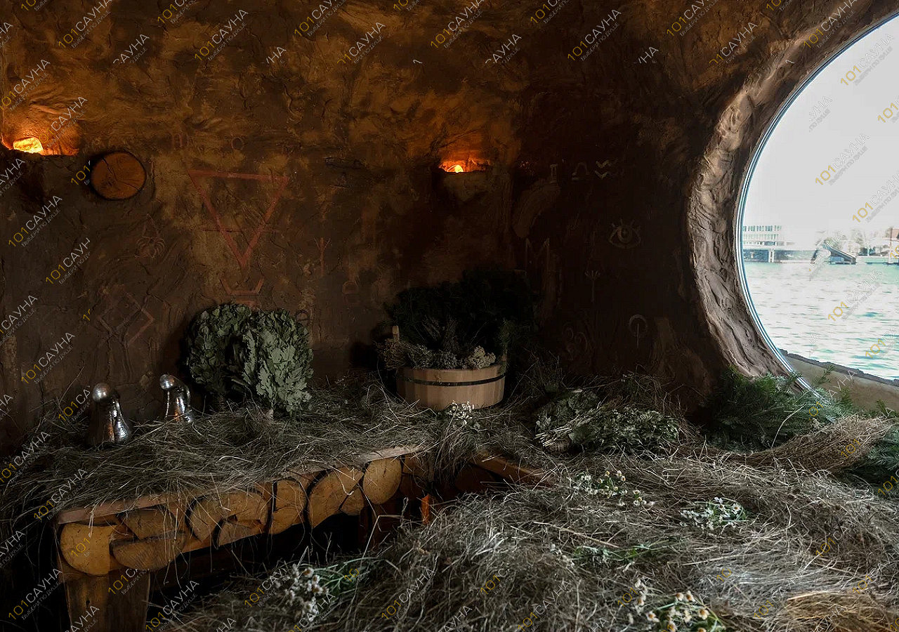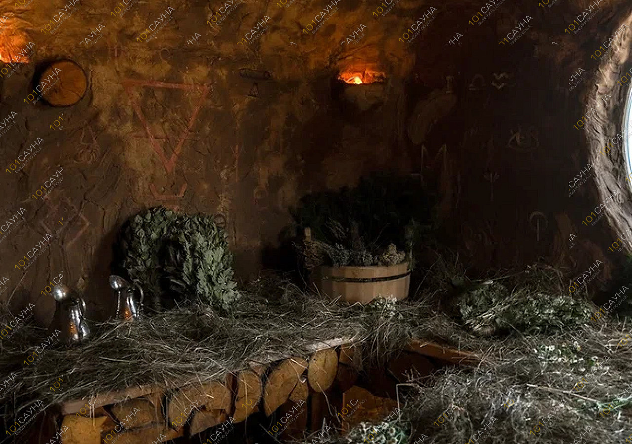 Глиняные стены с наскальными ликами хранят тепло печи-каменки, а сквозь парное марево виднеется река. Её воды мерцают в сумерках, будто шепчут тайны.