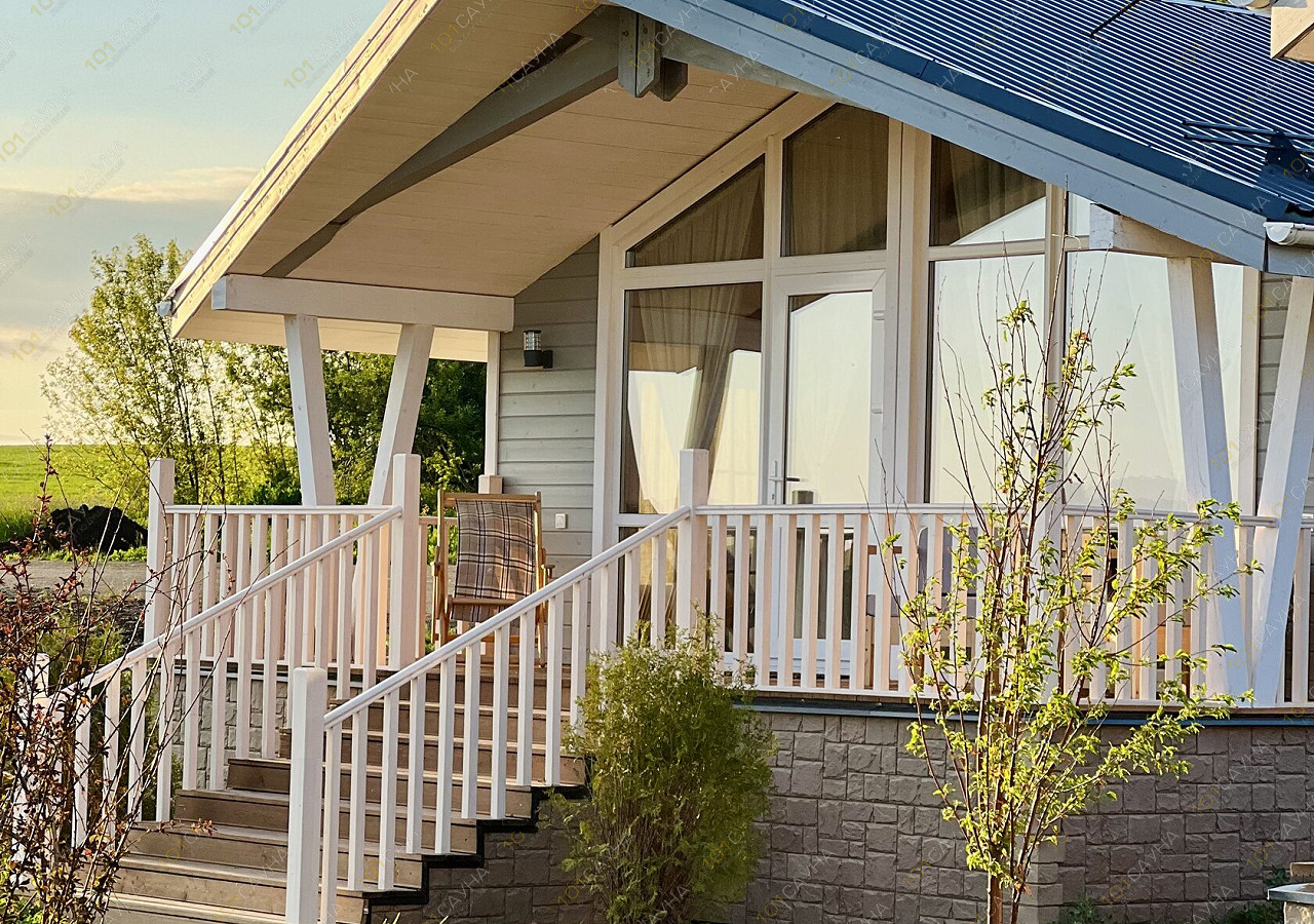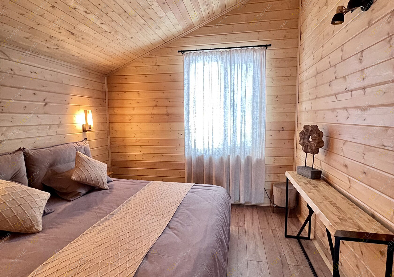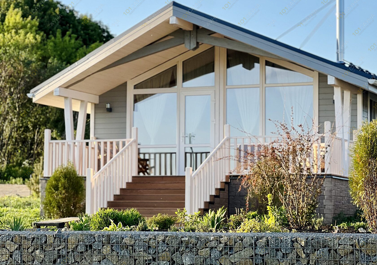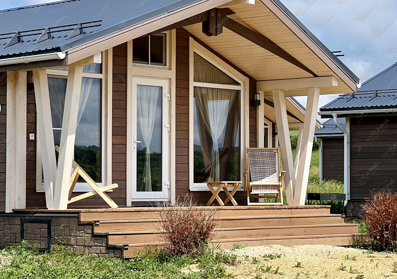 Расположен на берегу речки. Располагает открытой террасой с купелью.