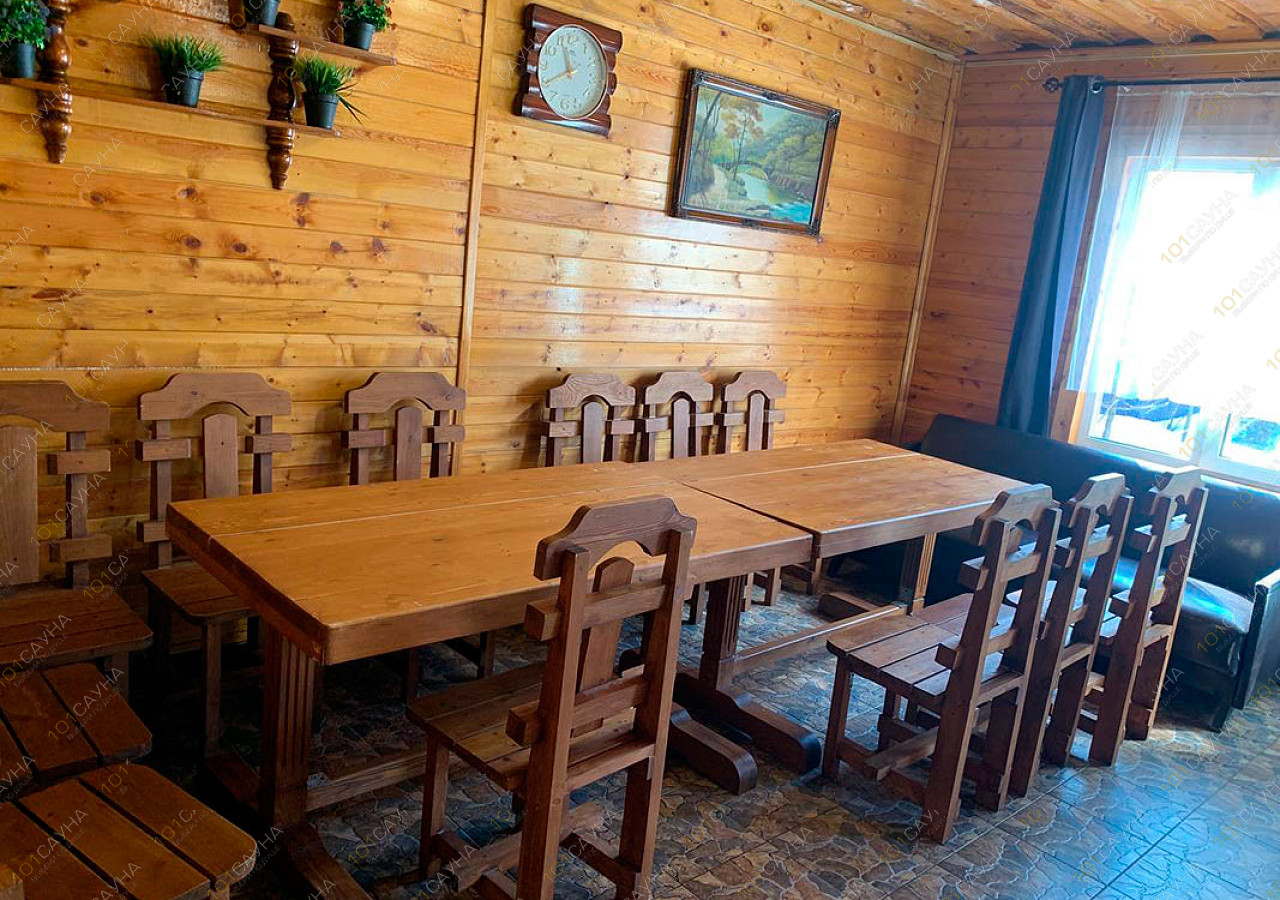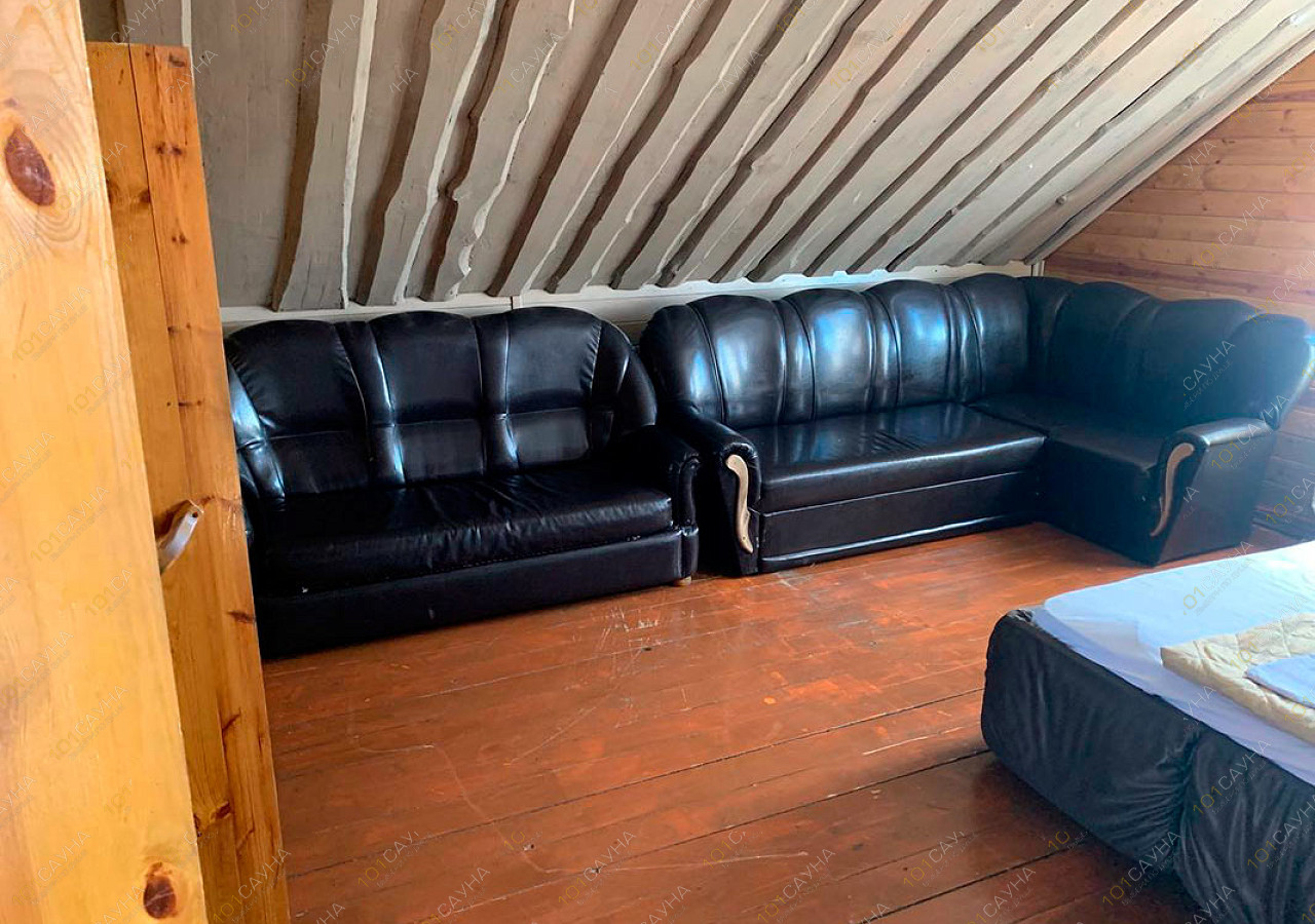 Большой дом 2 этажа. На первом этаже большая гостиная, совмещённая с кухней, сауна-баня, купель с холодной водой, душевая, санузел. На втором — гостиная и три спальни. Три кровати + два раскладных дивана. В доме: телевизор, холодильник, микроволновка, электроплита, электрочайник, посуда, фен для волос, Wi-Fi. Во дворе крытая беседка (с освещением) и мангал.