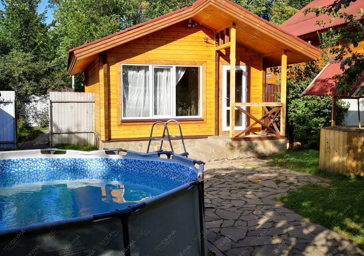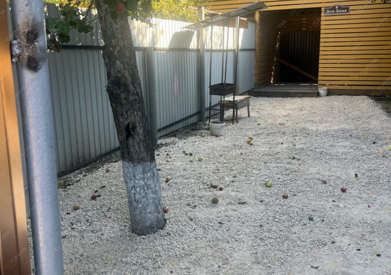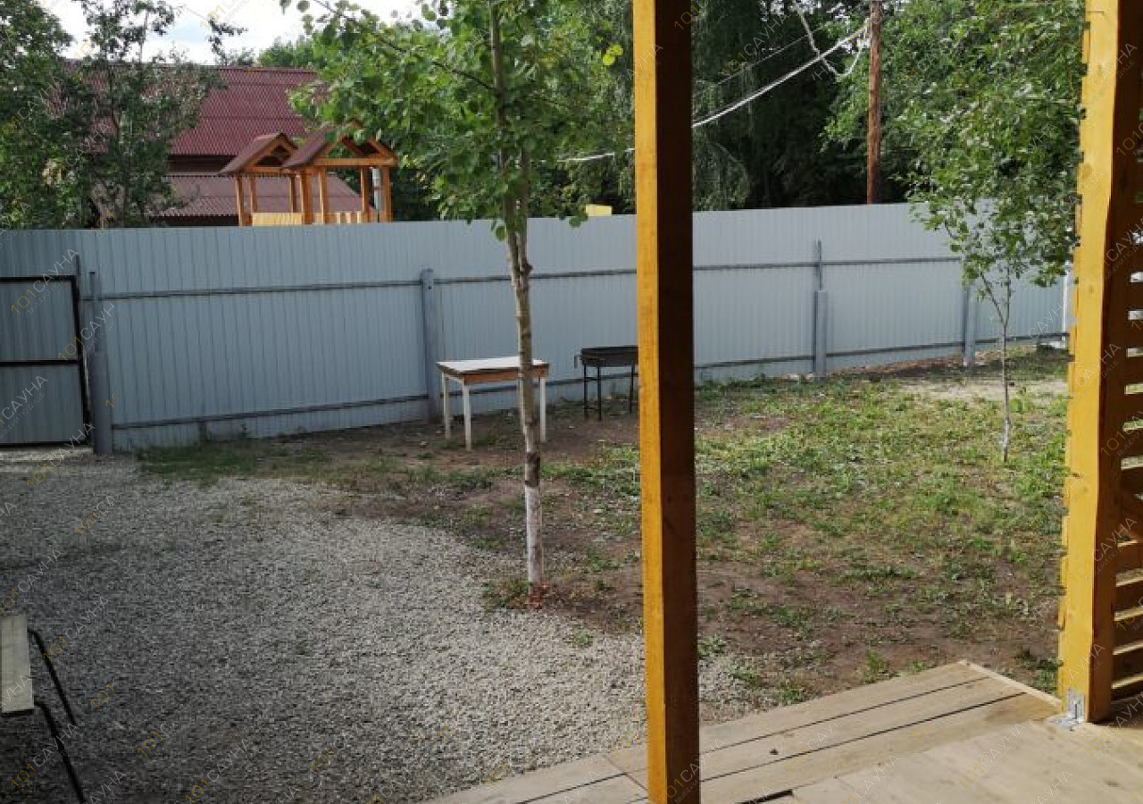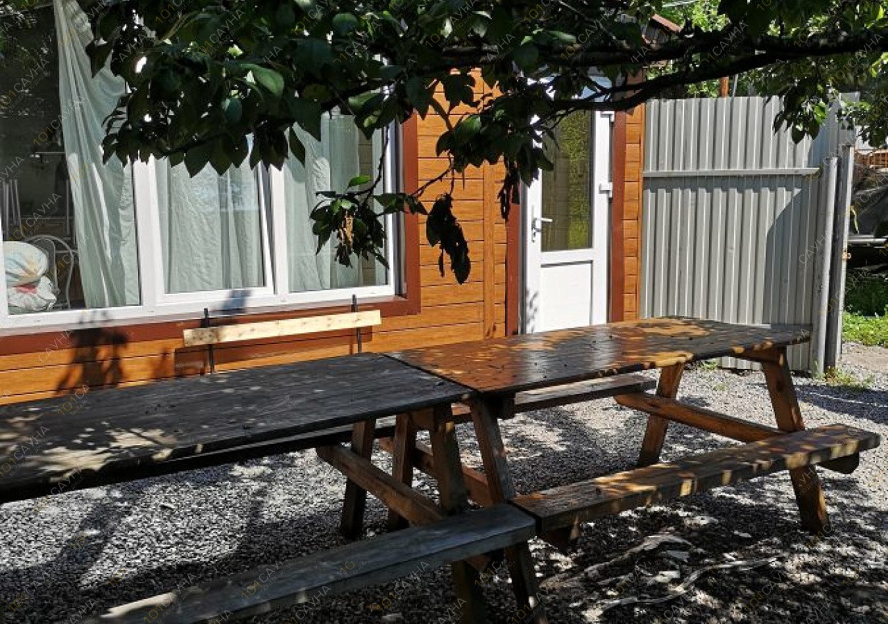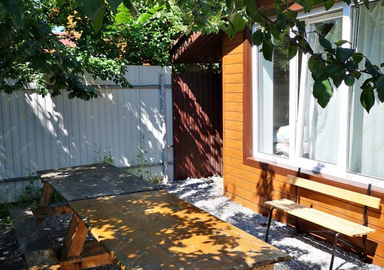 Самый маленький гостевой домик с очень небольшим двориком — изначально домик для двоих. День и вечер вы проводите с гостями (в домике может разместиться человек шесть, а во дворе за большим столом и больше десяти), паритесь, жарите шашлык, общаетесь и трапезничаете в дружной компании до самой ночи. А ночью остаётесь вдвоём. Только вы, ночь и звёзды. Если есть ребёнок, то для него предусмотрена раскладушка. Хоть сам двор совсем маленький — только для посиделок за столом, но преимущество домика для гостей с детьми — рядом детская площадка: детям будет чем заняться и они будут под присмотром просто при открытой калитке.