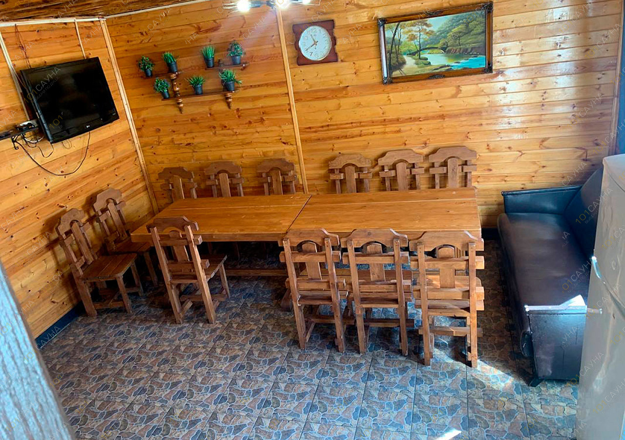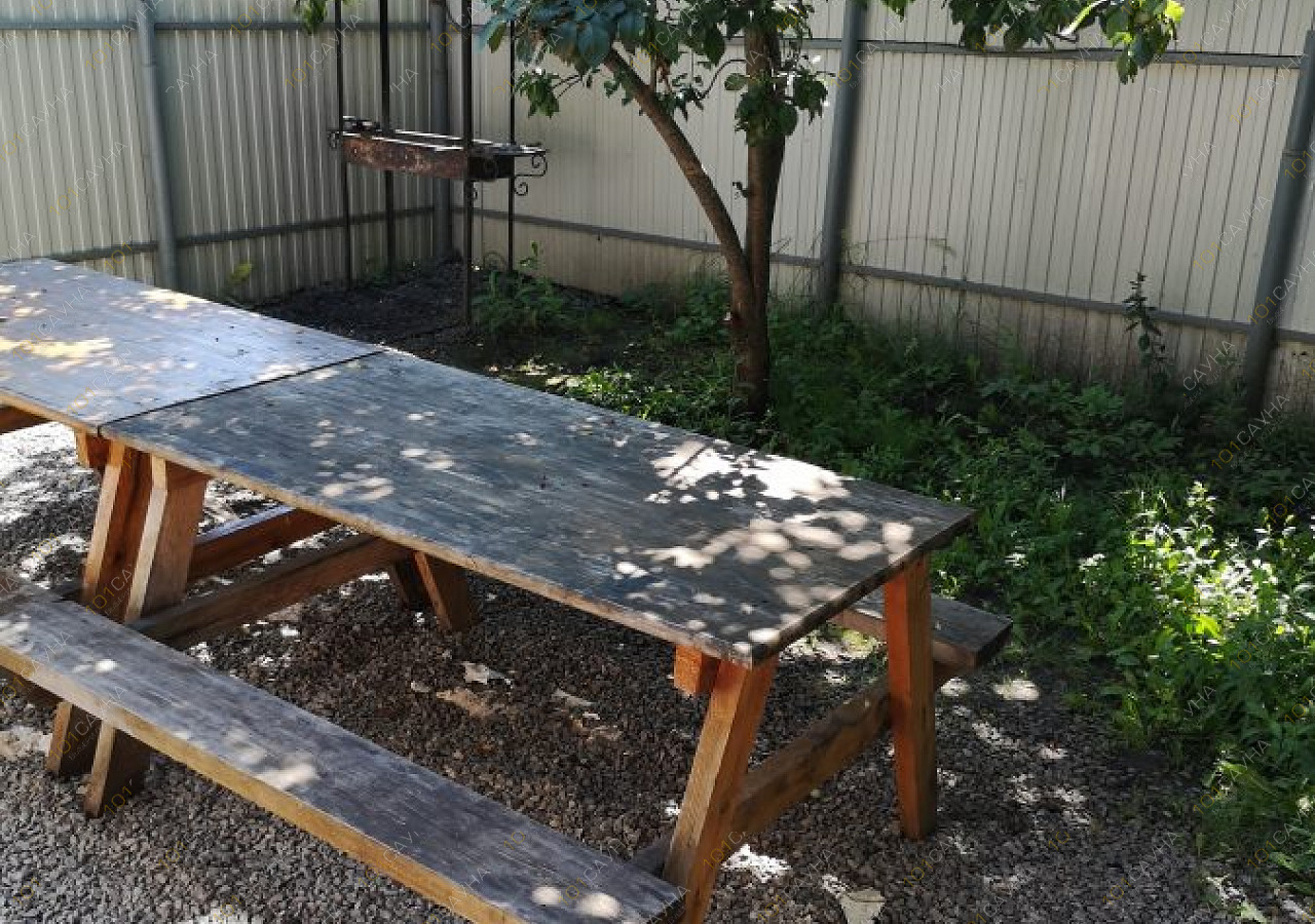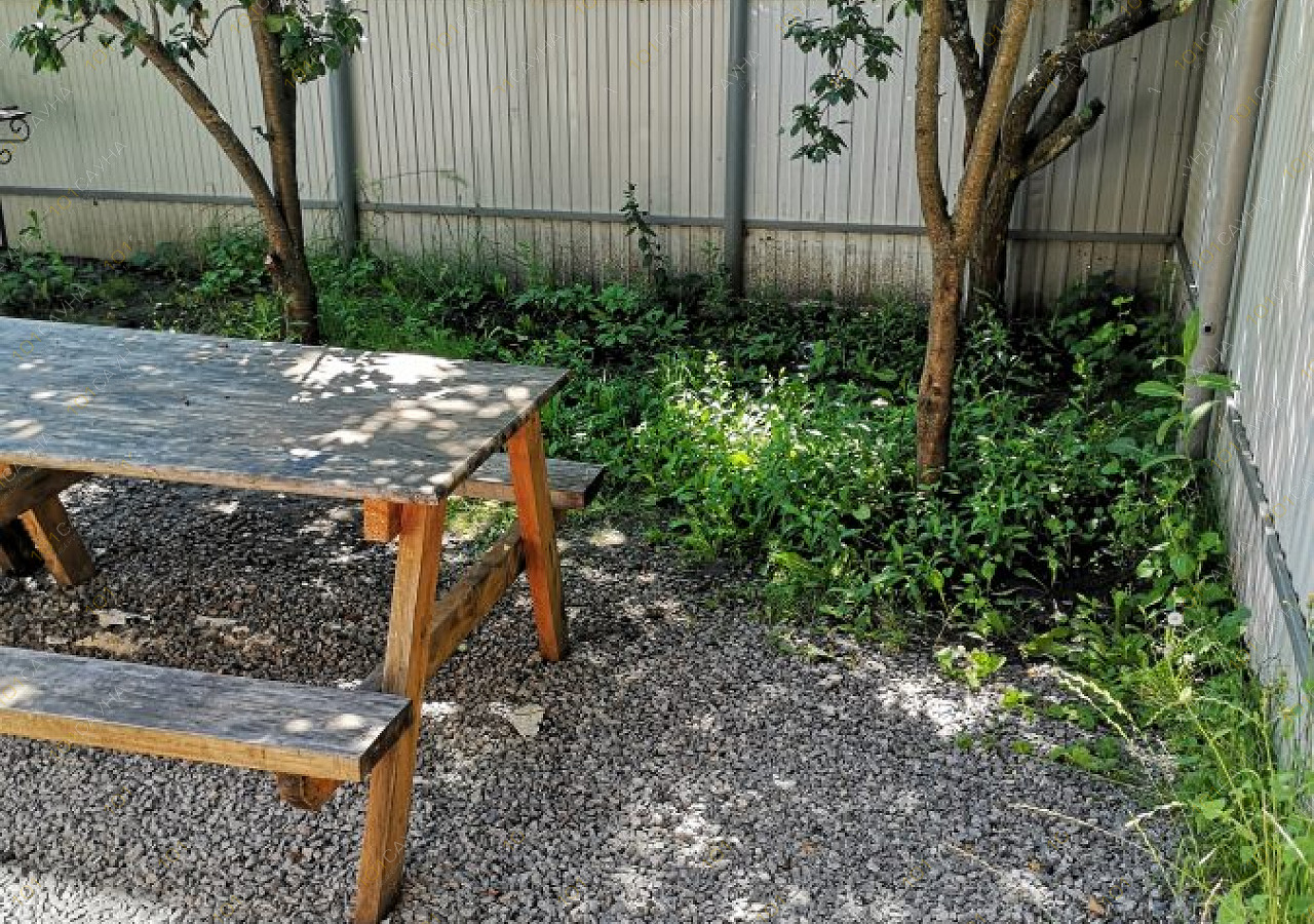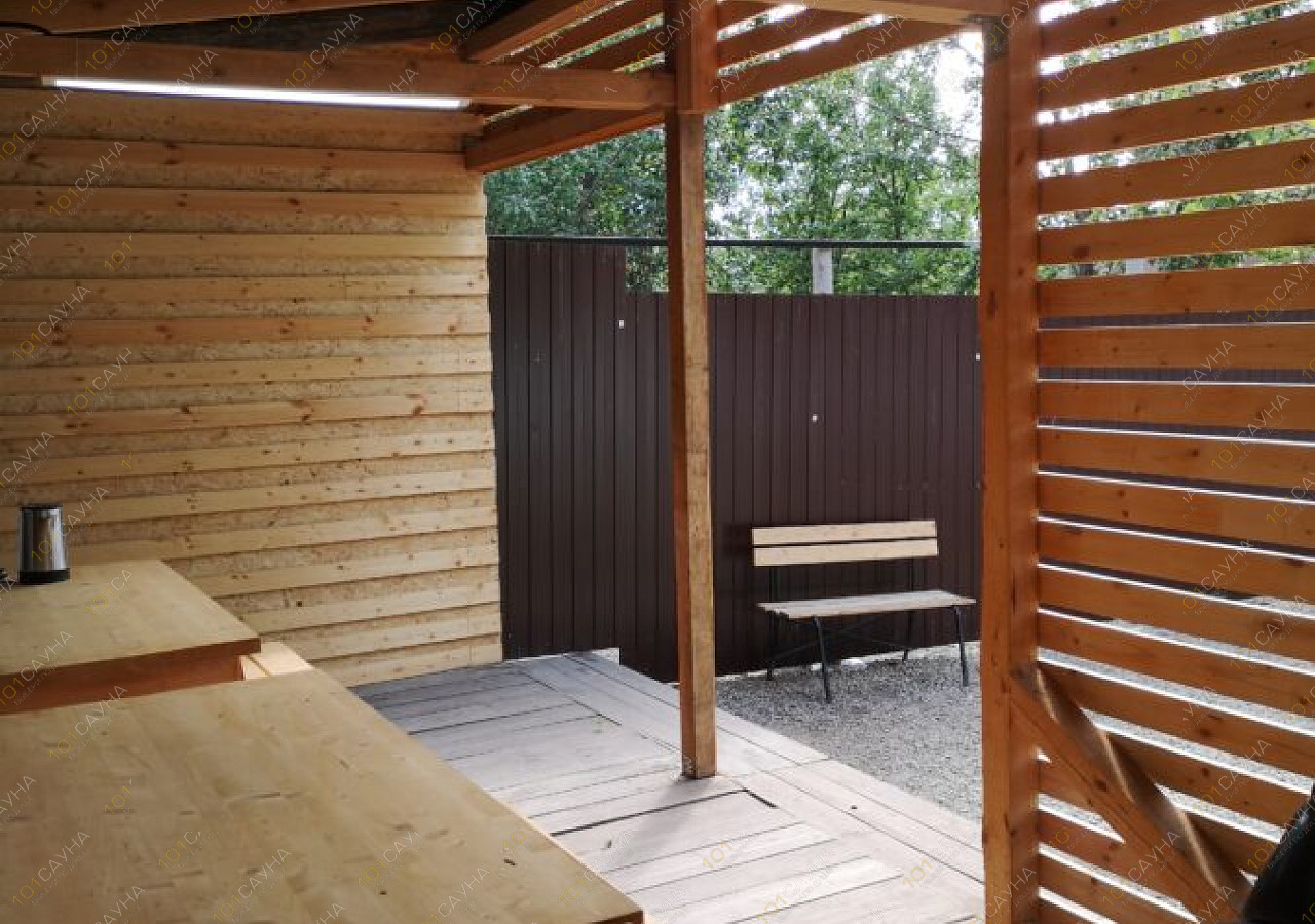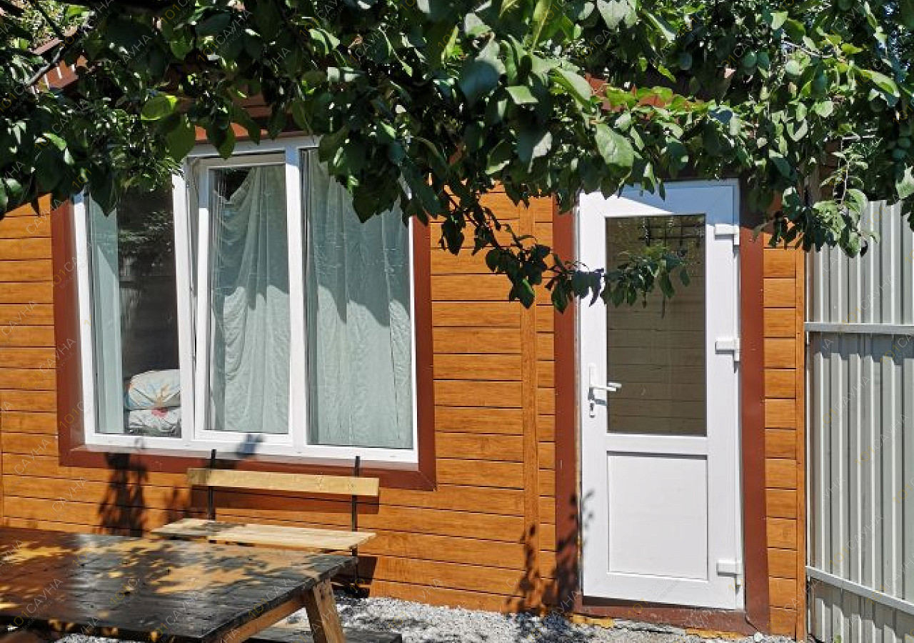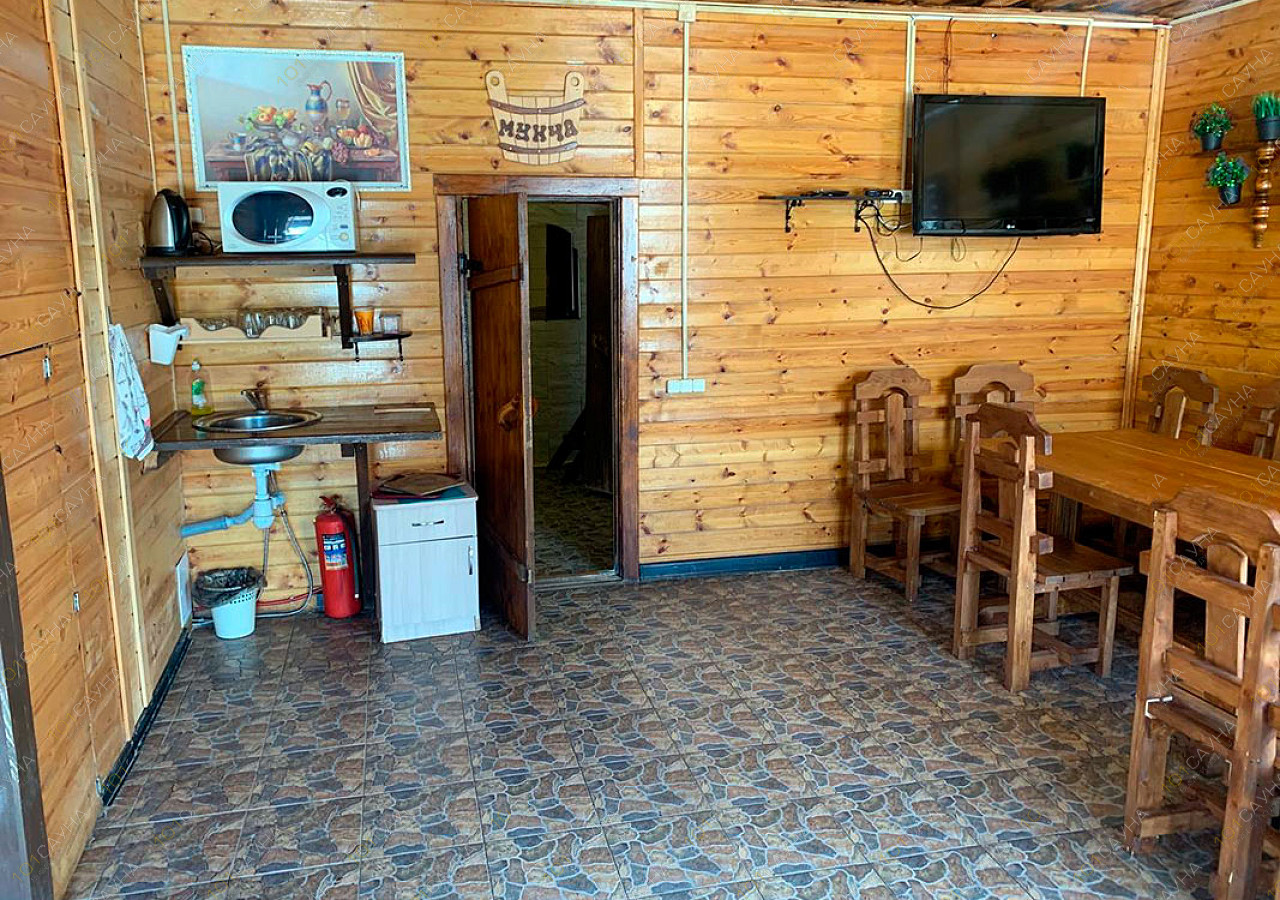 Самый маленький гостевой домик с очень небольшим двориком — изначально домик для двоих. День и вечер вы проводите с гостями (в домике может разместиться человек шесть, а во дворе за большим столом и больше десяти), паритесь, жарите шашлык, общаетесь и трапезничаете в дружной компании до самой ночи. А ночью остаётесь вдвоём. Только вы, ночь и звёзды. Если есть ребёнок, то для него предусмотрена раскладушка. Хоть сам двор совсем маленький — только для посиделок за столом, но преимущество домика для гостей с детьми — рядом детская площадка: детям будет чем заняться и они будут под присмотром просто при открытой калитке.