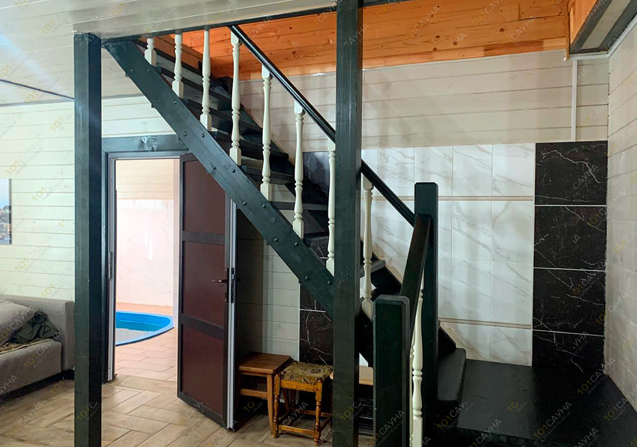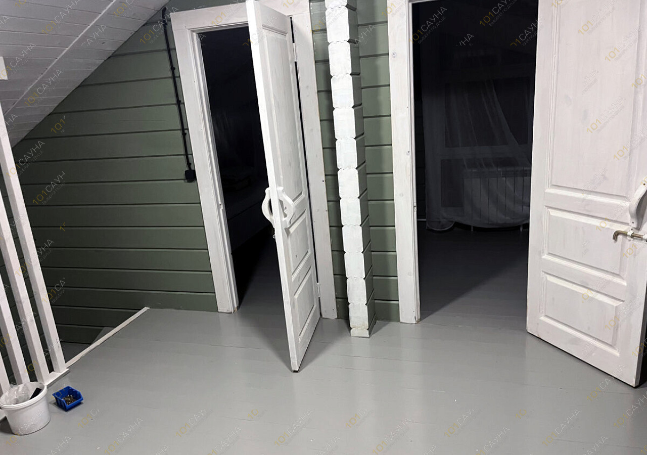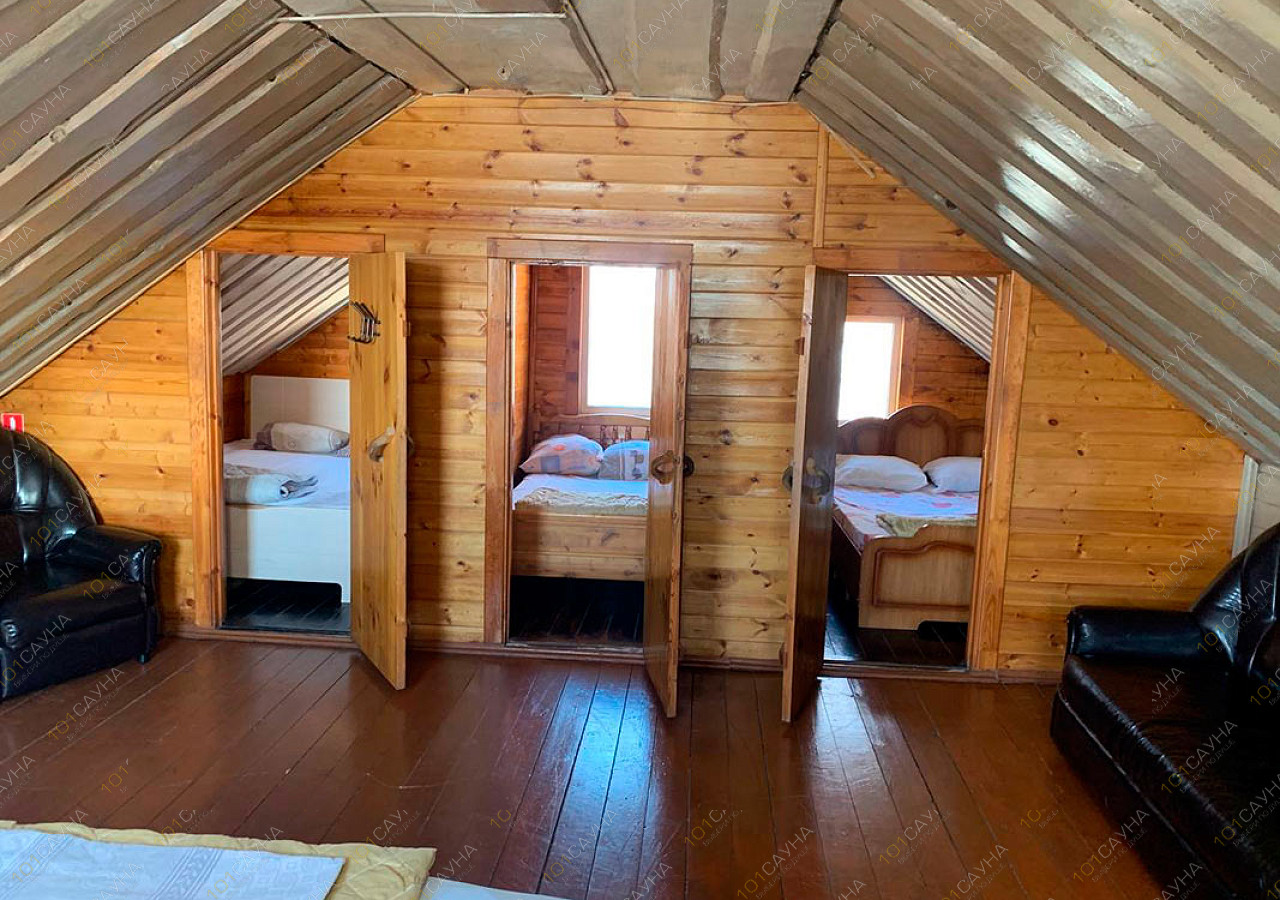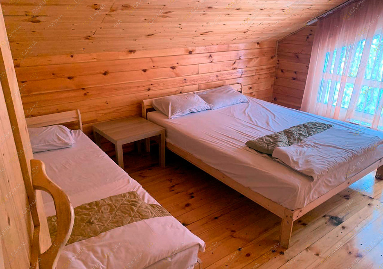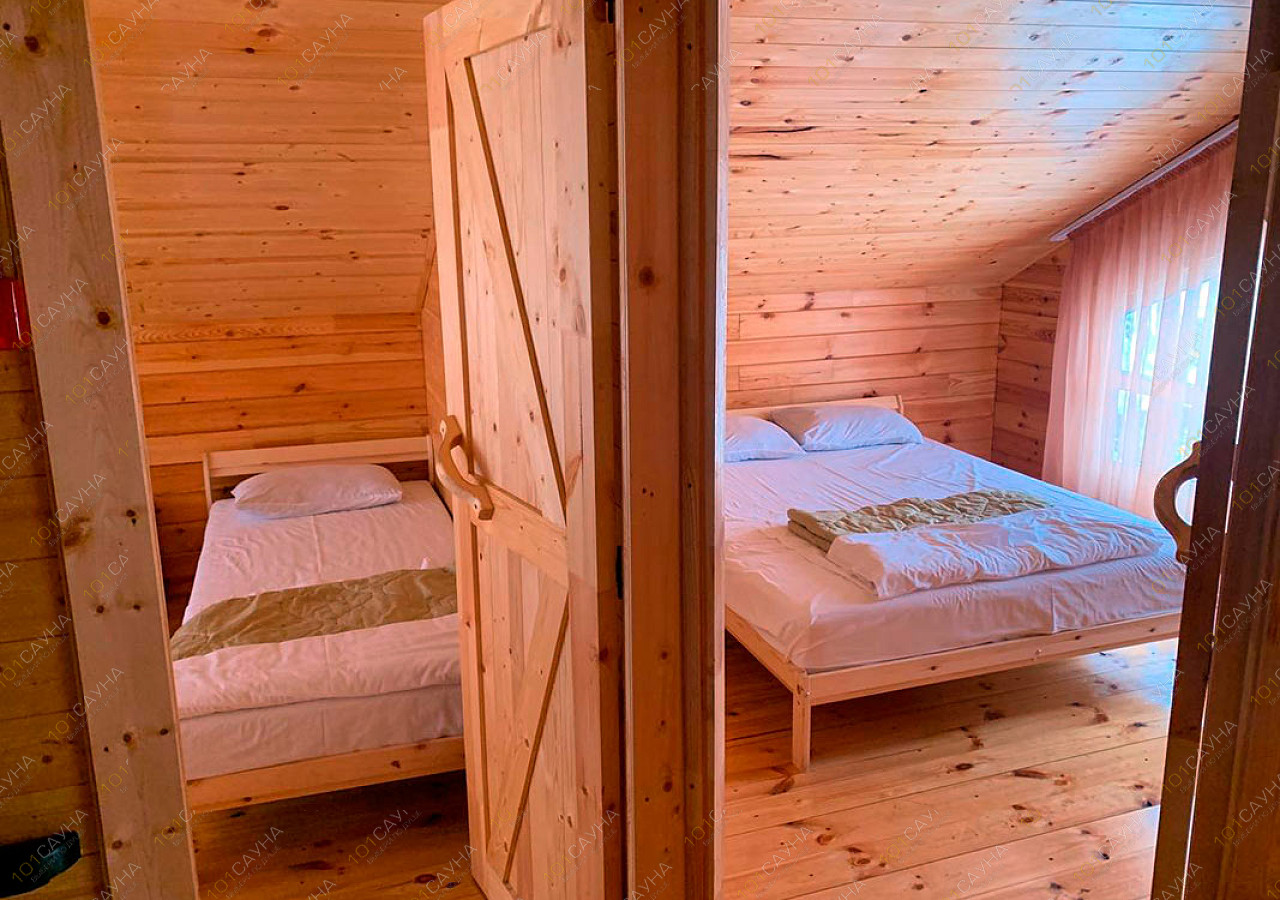 Большой дом — 2 этажа. На первом этаже — большая гостиная, совмещённая с кухней, сауна-баня, бассейн-купель 2×2 м (глубина 70), душевая, санузел. На втором — четыре спальни. Четыре двуспальные кроватки, плюс два раскладных дивана.