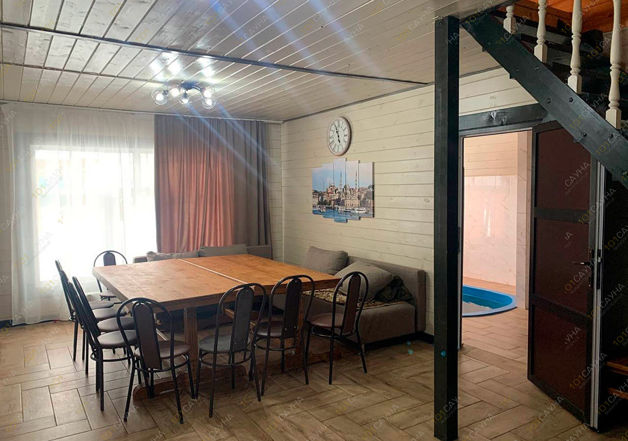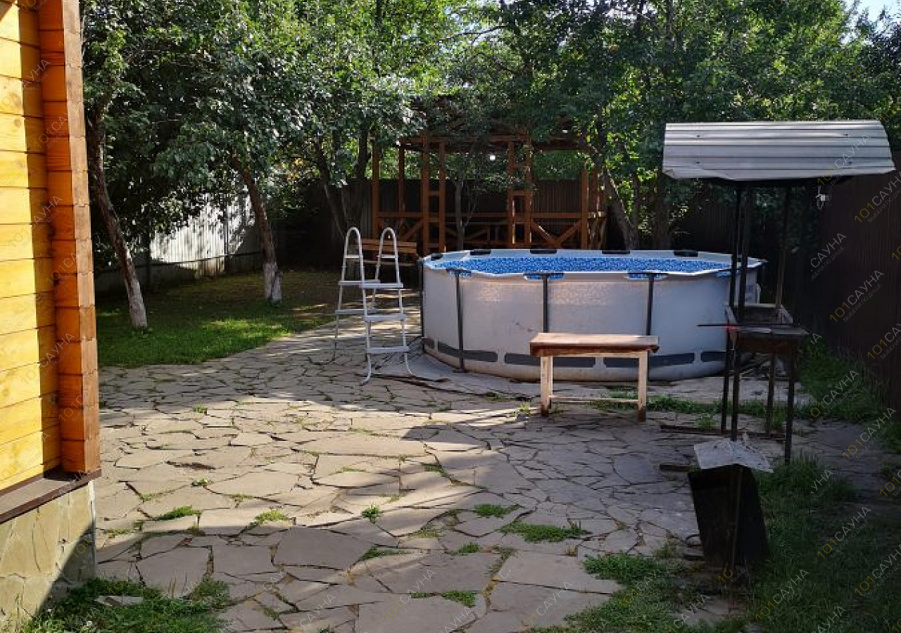 Большой дом 2 этажа. На первом этаже большая гостиная, совмещённая с кухней, сауна-баня, бассейн 3×3 м, душевая, санузел. На втором — четыре спальни. Четыре двуспальных и две односпальных кровати + два раскладных дивана. В доме: телевизор, холодильник, микроволновка, электроплита, электрочайник, посуда, фен для волос, Wi-Fi. Во дворе крытая беседка (с освещением) и мангал.